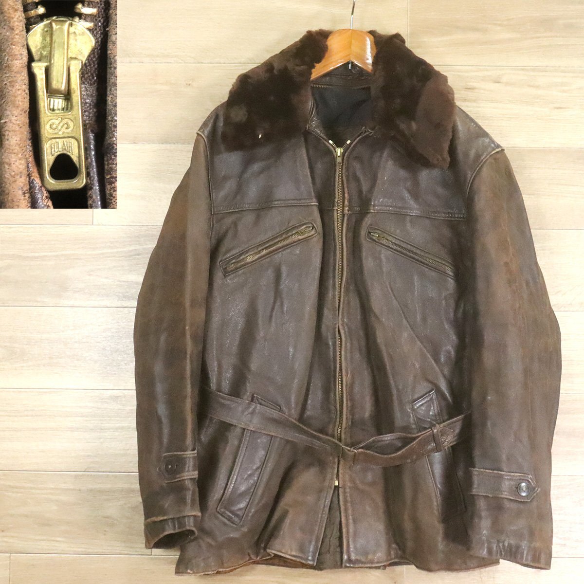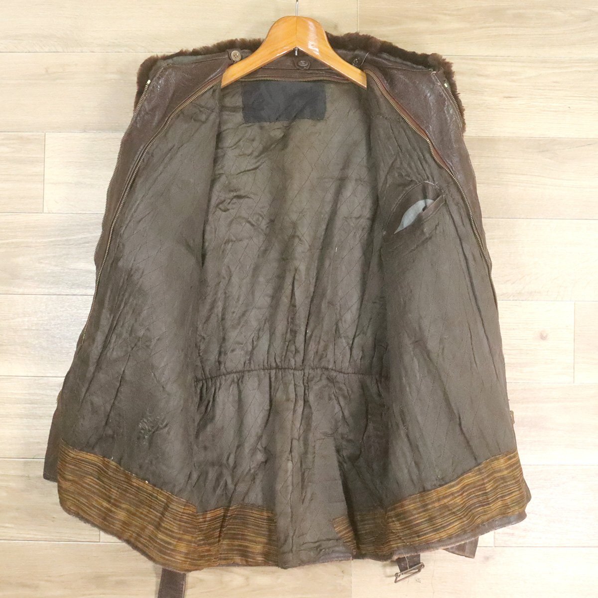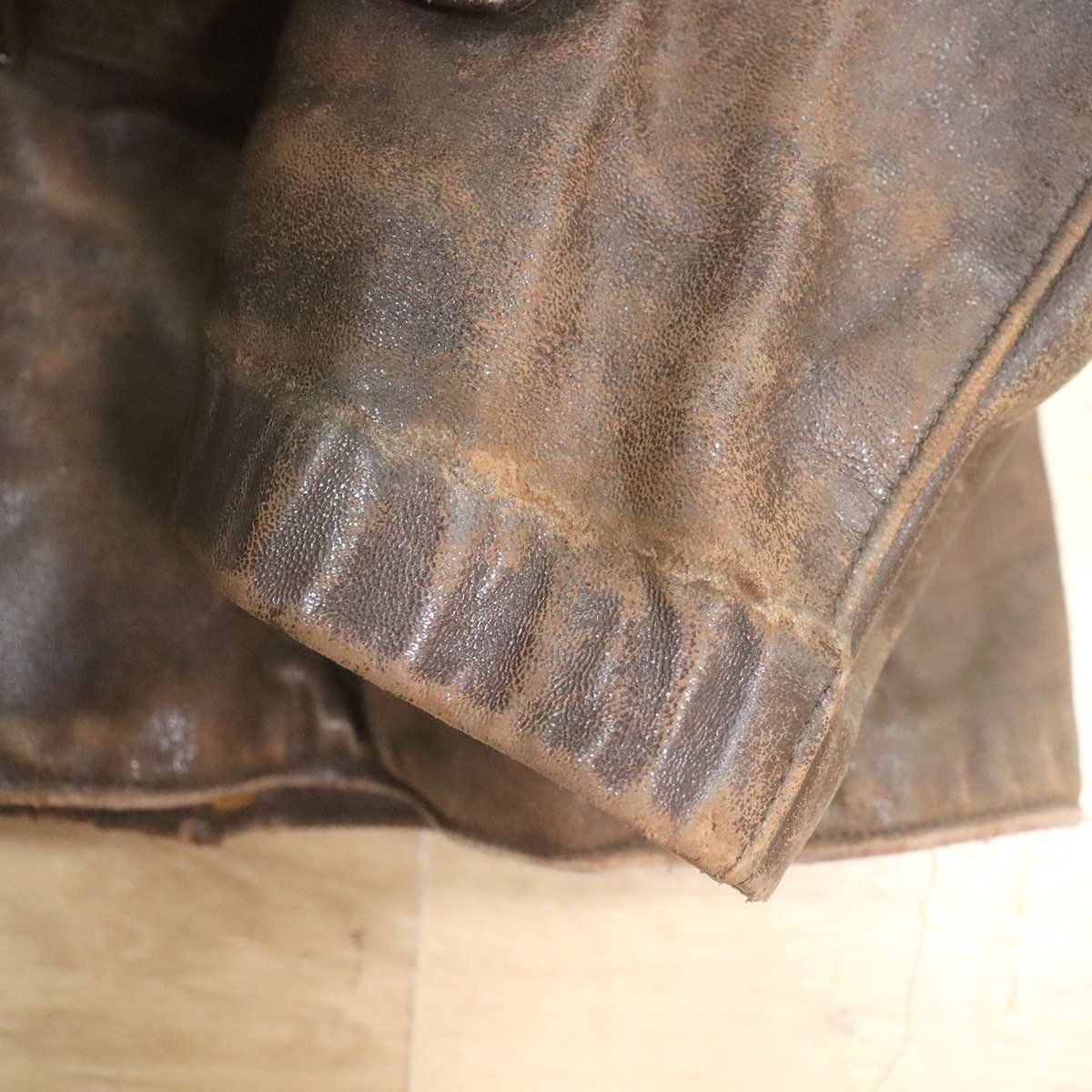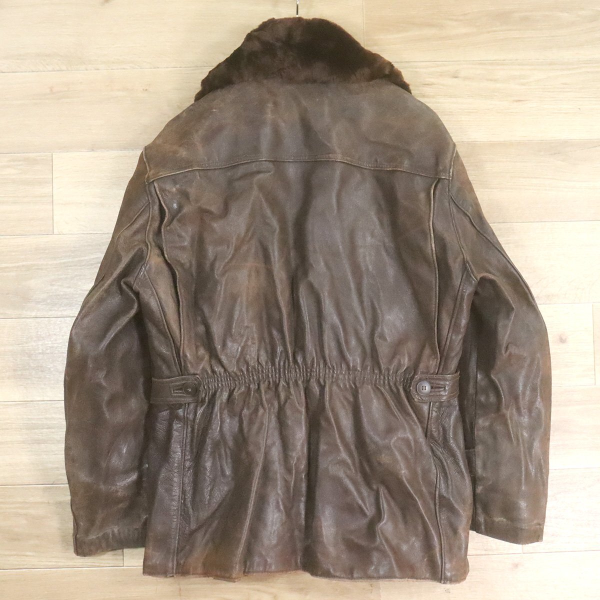 中古品です。使用感があります。全体的にレザー特有の色褪せ、擦れ、擦り切れがあります。裏地にも擦り切れが見られます。右袖先のアジャスターのボタン、襟のボア部分のボタンが付け替えてあります。ライナーは付いていません。