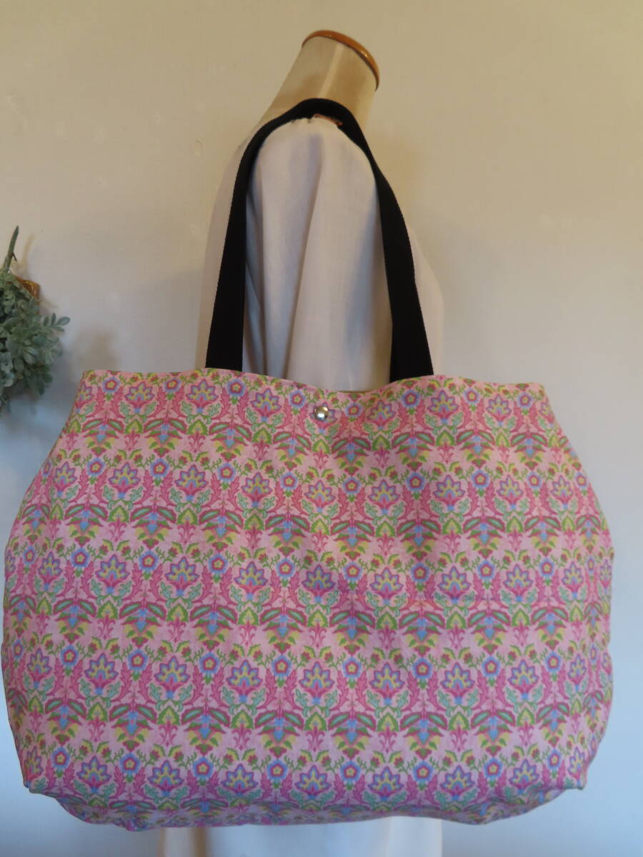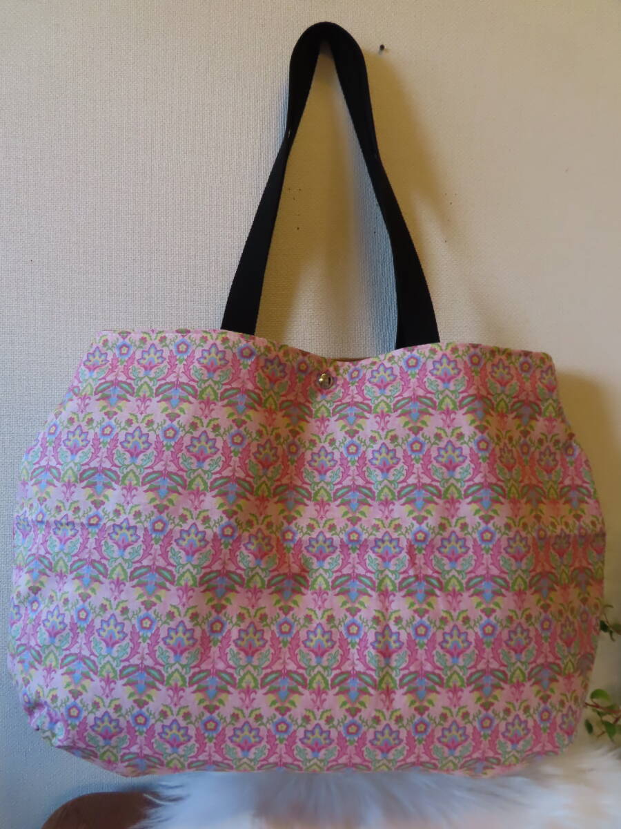 39 ハンドメイド ころんと丸い BIG肩掛けトートバッグ  ダマスク模様 ピンク柄 プリント