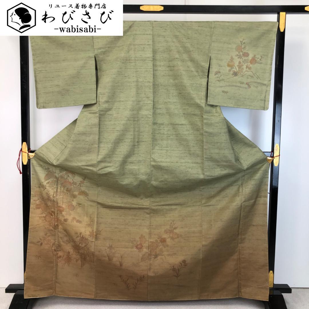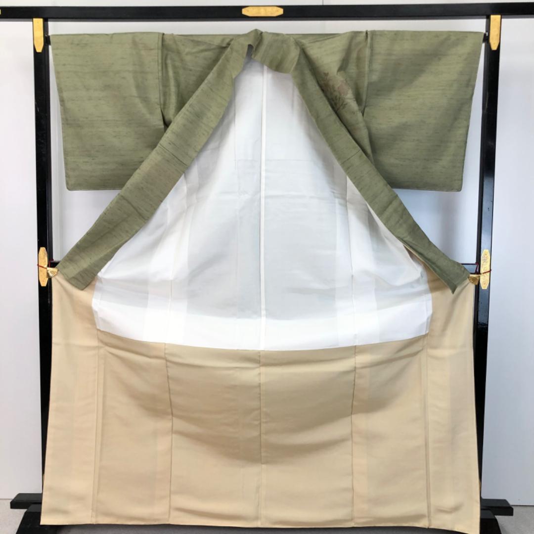付下げ 紬 相良刺繍 松に花模様 利休色 しつけ糸 トールサイズ K-5511