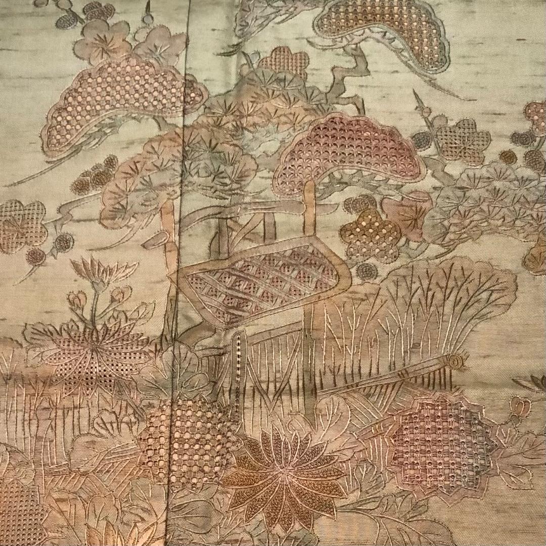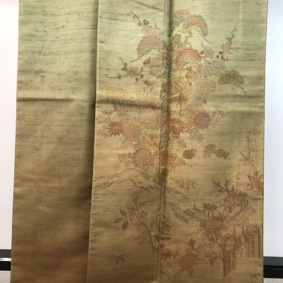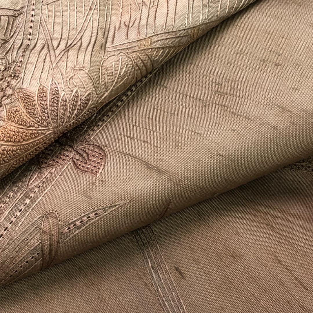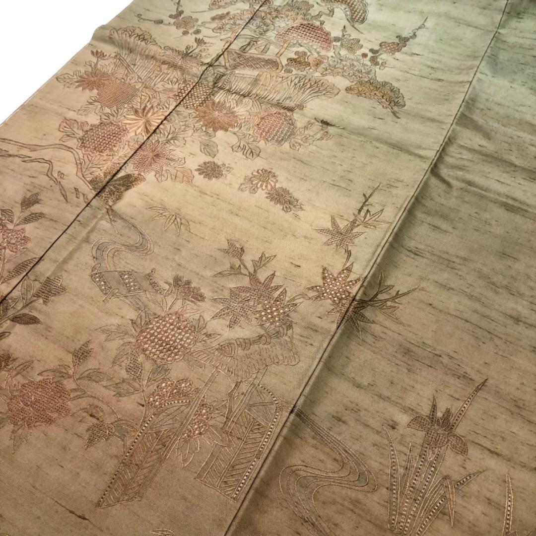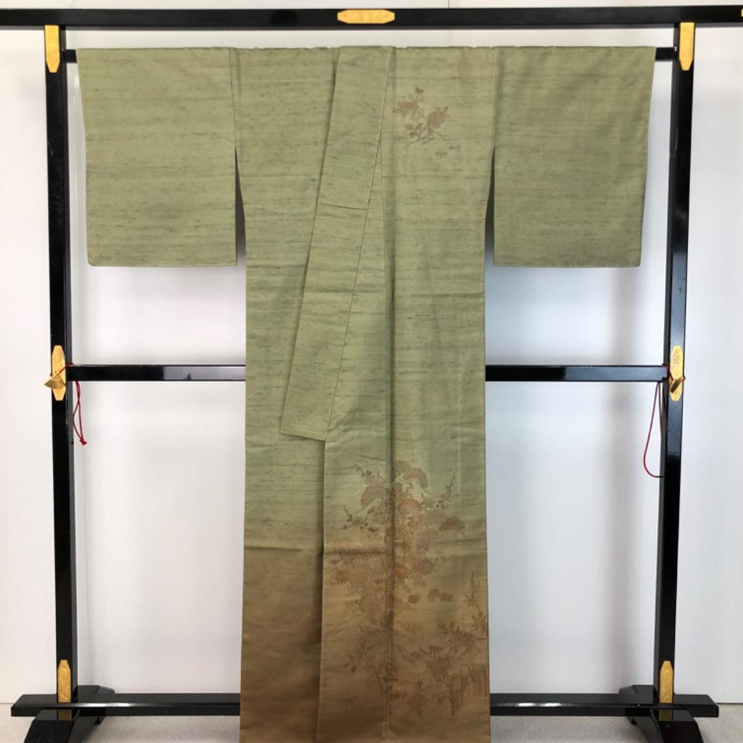 利休色ベースのお色味の紬地に暈し、相良刺繍、汕頭刺繍の松、花模様の柄裄がデザインされた雰囲気の良い素敵なお品でございます。