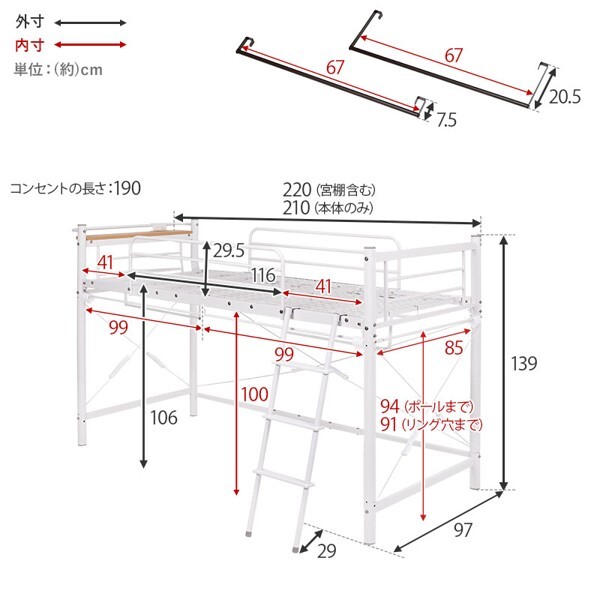 ※現在ご覧の商品ページはホワイトのご購入ページとなります。 ヤフオクの仕様上単一ページに複数バリエーションを掲載することができませんので、他バリエーションが希望の場合は別ページでご購入お願い致します。 ベッド下の空間に市販のカーテンを取り付け可能なパイプロフトベッド。 ハンガーポールもついているので衣類収納としても活躍。 床面が高すぎず、小物などの収納スペースも確保できるロータイプ 配達業者を指定いただくことはできません。 北海道/沖縄/離島のお届けに別途中継料金が発生します。 ※別途送料が発生する場合は後ほどご連絡させていただきます。 当店は正規店です。 タイミングによっては在庫切れの場合があります。