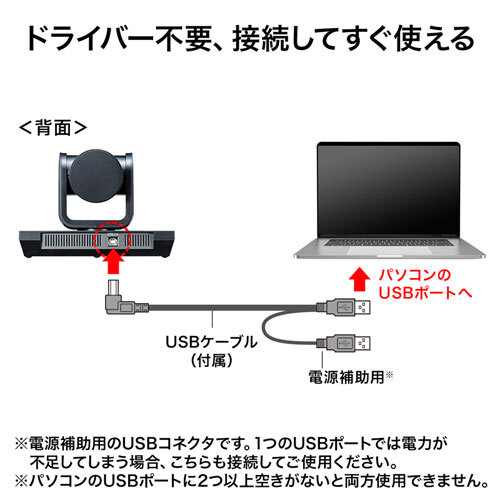 ※配送の送り主はサンワサプライ(株)と記載されています。沖縄・離島配送不可となります。 当店は正規販売代理店です。 特長 光学3倍ズームレンズを搭載した会議用カメラです。 画角84°の広角レンズを採用しているので、少人数の会議ならリモコン操作でカメラの向きを変更しなくても画面に収まります。 210万画素、1/ 2.9インチHD CMOSセンサー、解像度1920×1080フルHD画像を実現しました。 ZoomやTeamsなどのソフトで簡単に使用できます。 MJPEG出力フレームレート1080P/30fpsです。 付属のリモコンを使い水平±165°、垂直-30°~+30°の範囲でカメラの向きを変更できます。 USBケーブル1本で動作可能です。別途電源接続は不要です。 壁取付金具が付属し、壁に取り付けることができます。またオプションの天井取付金具(CMS-STN3BK)を使用することで天井取付も可能です。 カメラ用三脚穴を内蔵。市販のカメラ用三脚に取り付けできます。 メーカー保証期間180日 ※当店発注日からになります。 気をつけておりますが、タイミングによっては在庫切れの場合があります。 仕様