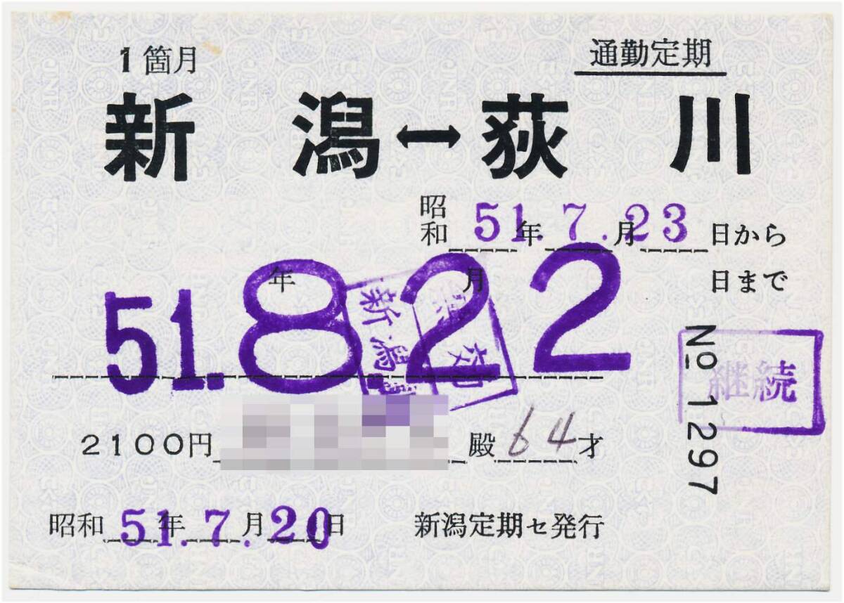 国鉄 新潟定期券センター発行 常備通勤定期乗車券 新潟←→荻川 です。
