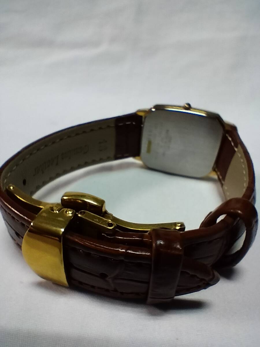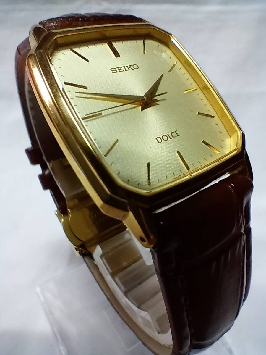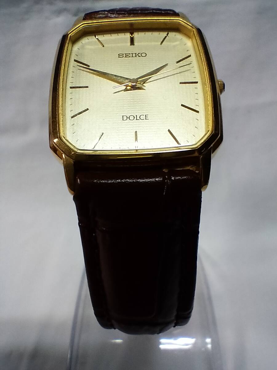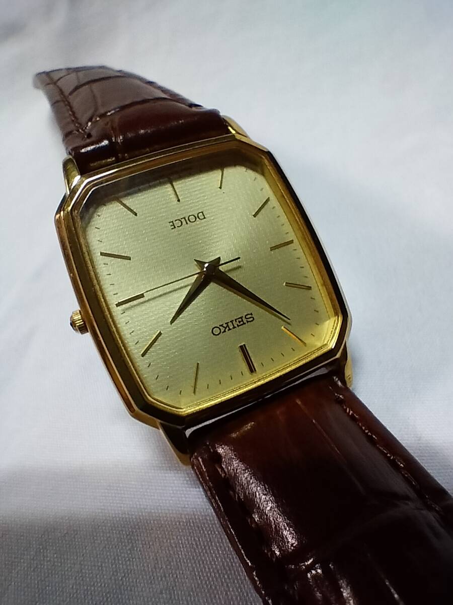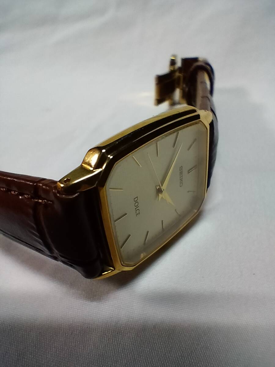極美 稼働品 新品Dバックルベルト 電池交換済SEIKOセイコードルチェ8J41-5000 材質SGP30 レクタンギュラー メンズ QZ 色ゴールドケース・盤