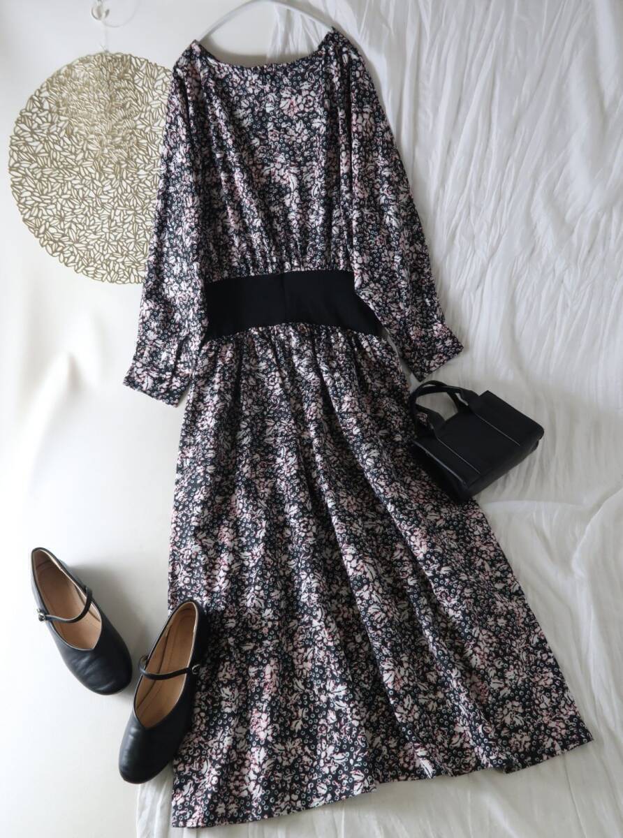 ブージュルード Bou Jeloud☆洗える ウエストリブ プリント柄 サイドパイピング フレアワンピース 38サイズ☆A-O 5014