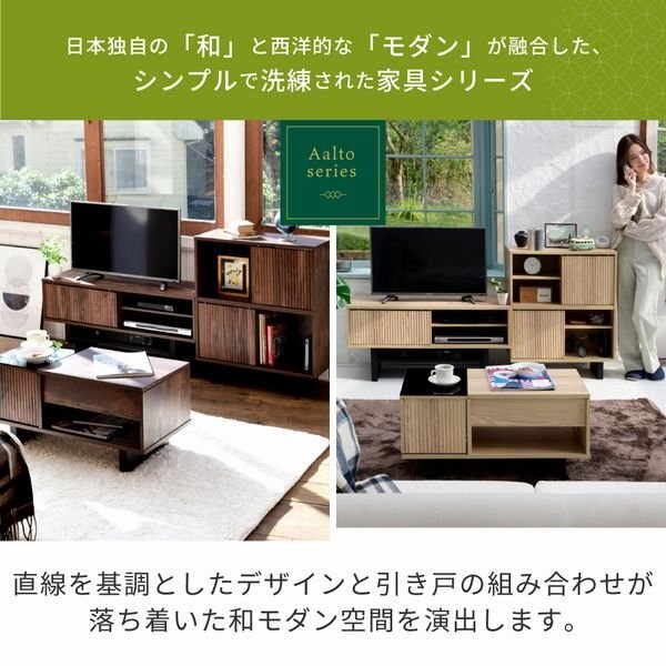 引き戸の波型が印象的な、落ち着きのある和とモダンなテイストを組み合わせた和モダンシリーズ"Aalto"。 シェルフは4か所の収納部が備わっており、好きな部分を引き戸で隠せるデザインとなっています。 |