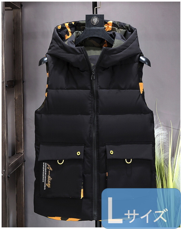 リバーシブル メンズ ダウンベスト 998 ブラック Lサイズ 中綿ダウン 中綿ベスト キルティング アウター 防寒 秋冬 暖かい