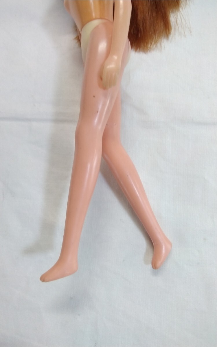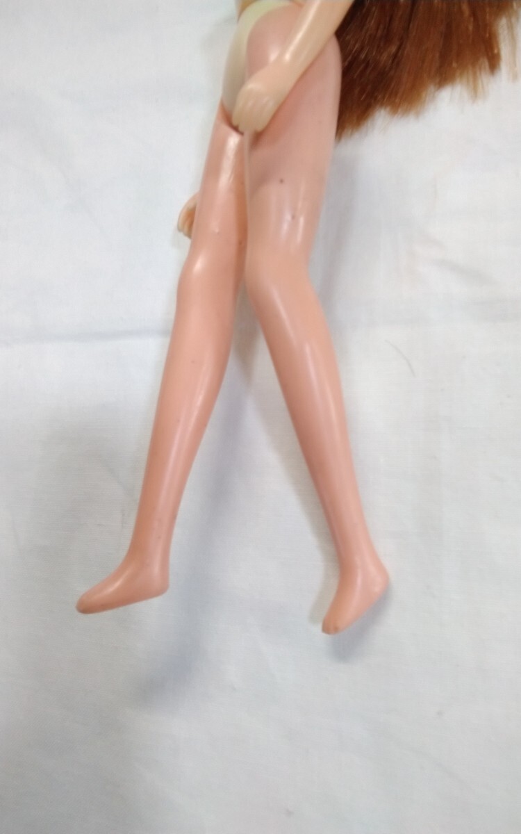 軽いチェックを行いました。使用感があります。膝関節曲がりました。ボディ左側方から脇にかけて変色しています(画像5)ドレス、アクセサリーなど付属品はすべて欠品しています。髪の痛み、関節の緩み、色褪せ、変色など見られます。当方素人につき詳しいことは分かりかねます。その他全体にわたって経年、長期保管による傷、汚れ、劣化などございます。画像でご判断ください