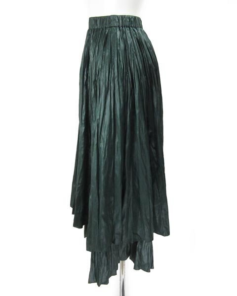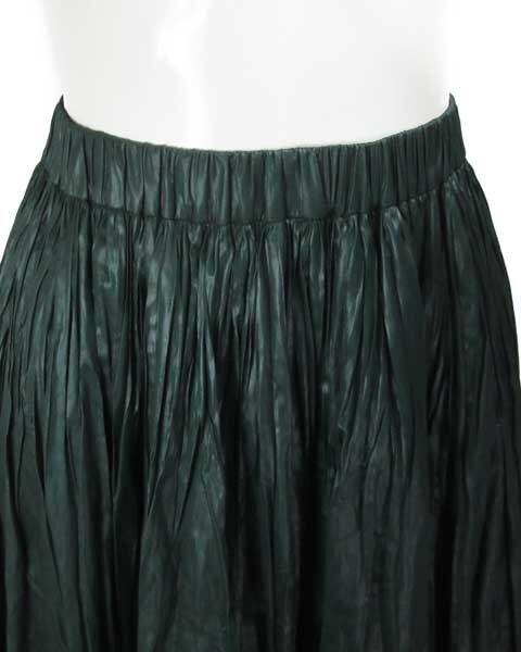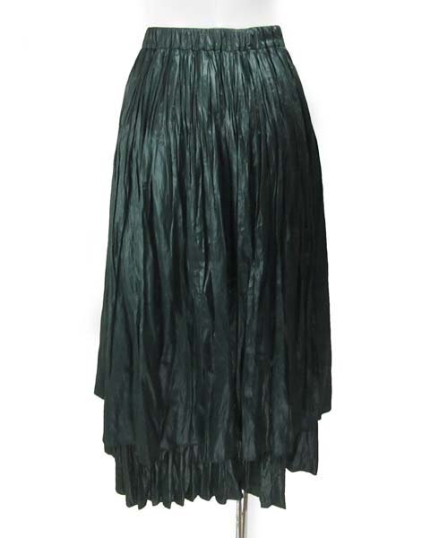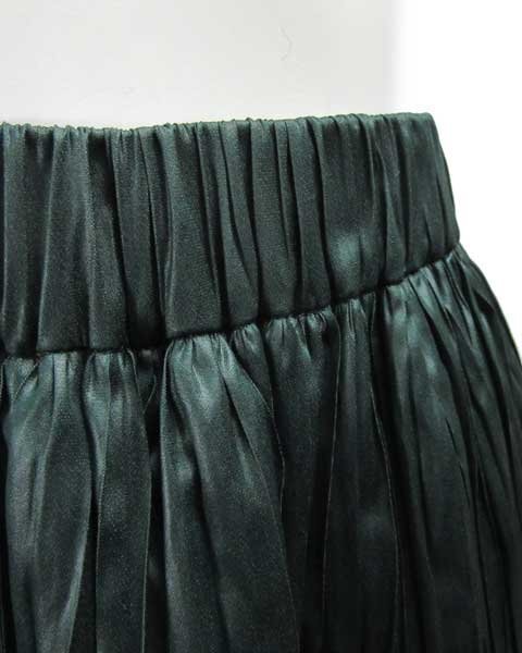 | 光沢のある深いグリーンのスカート。裏地のすそが表地より長くオシャレなデザインとなっています。きれい目大人女子スタイルが楽しめます。 |