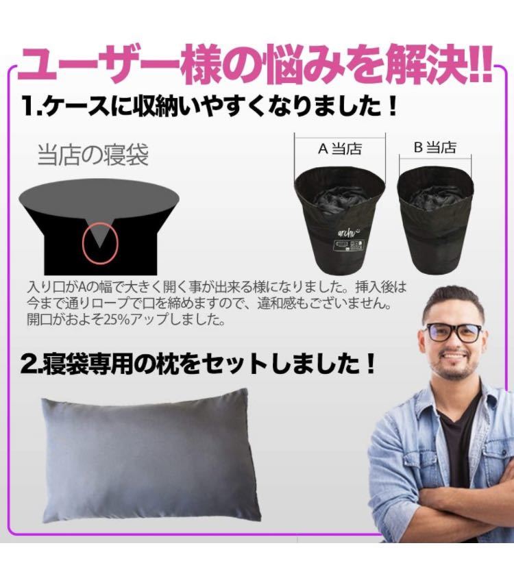 男性から女性までしっかり対応しています。簡単に収納でき、圧縮ベルトでコンパクトに持ち運びができ便利です。洗濯機で丸洗いできる寝袋ですので衛生的に使用できます。