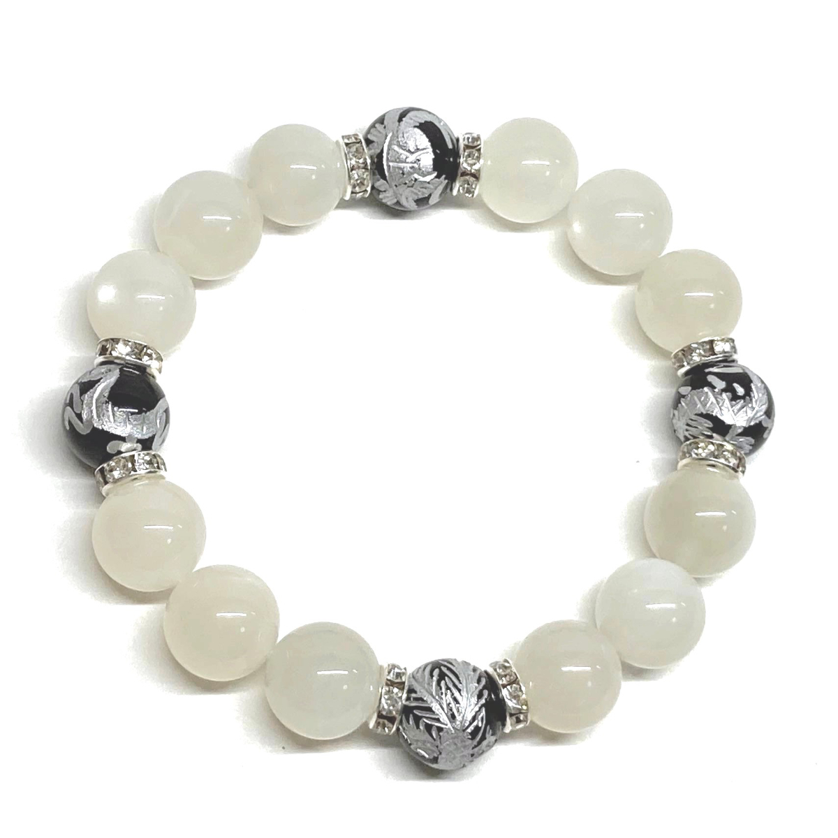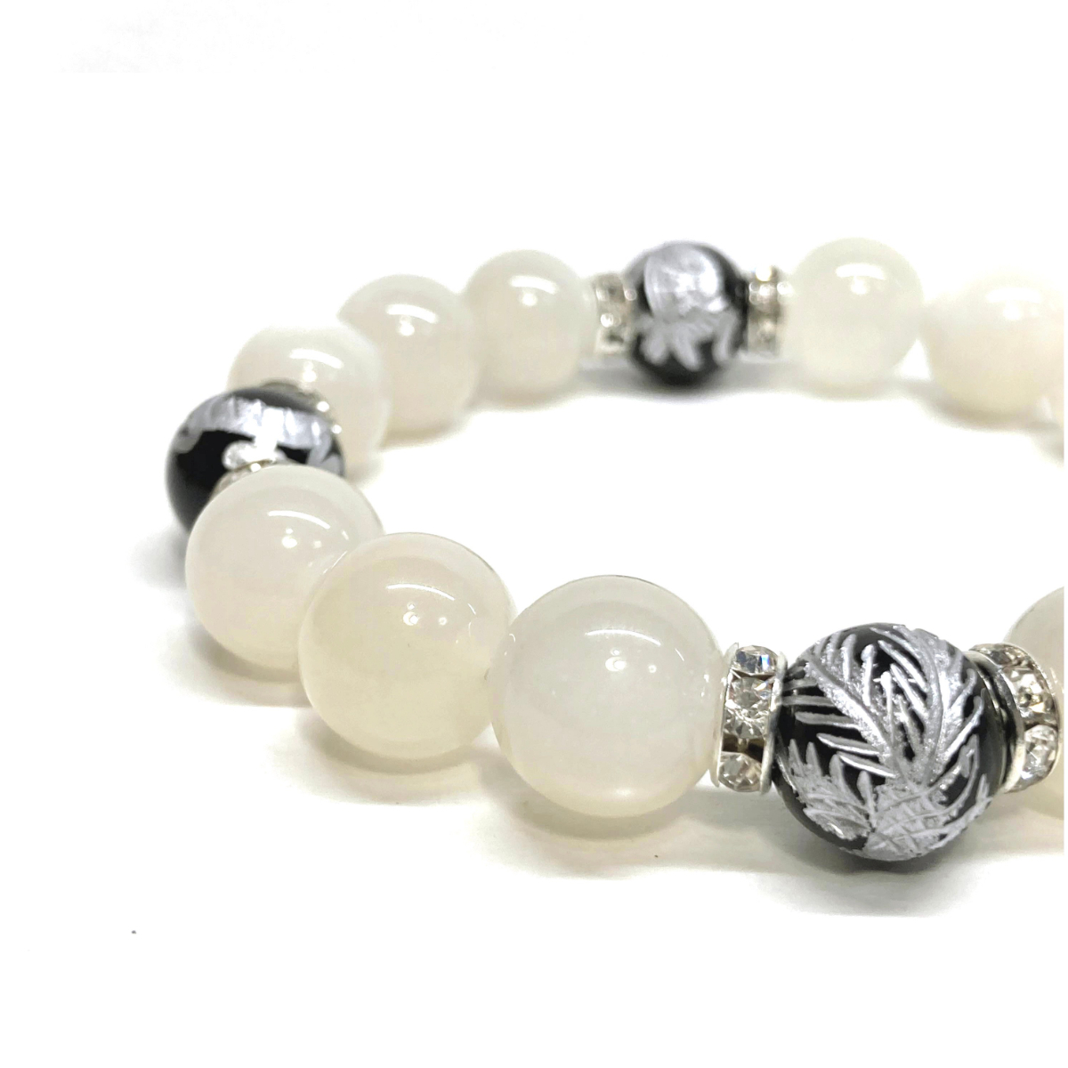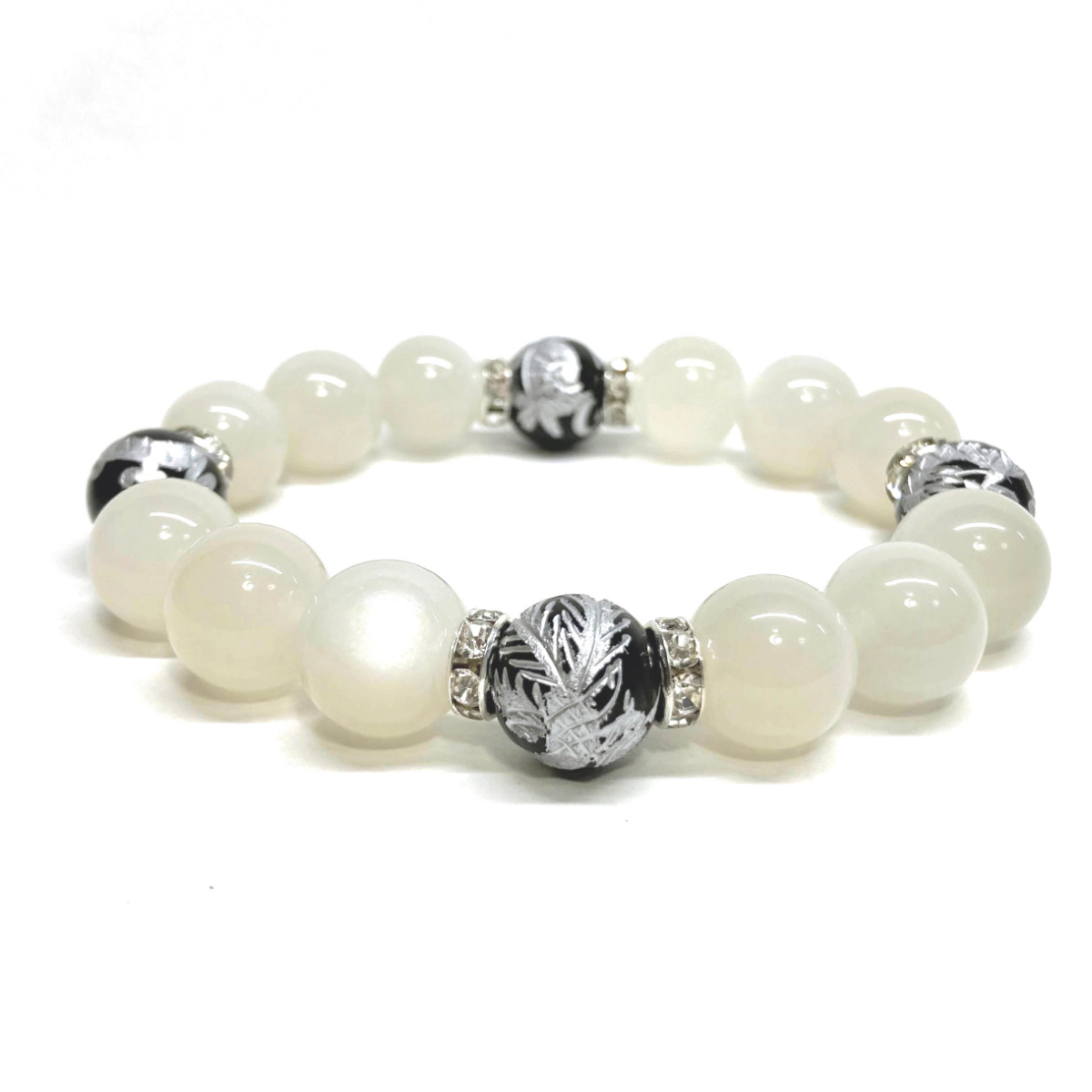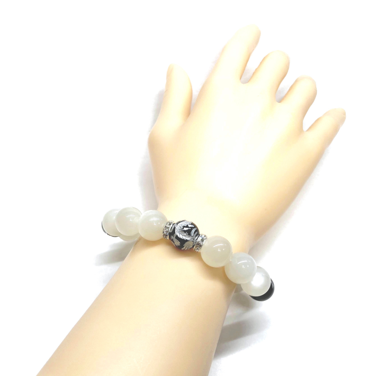 こちらは、四神獣銀彫オニキとムーンストーンを組み合わせたパワーストーンブレスレットです。四神獣は、中国の伝説で4つの方向(東西南北)を守護する神聖な神。四神獣、厄災から身を守り、多くの運気を呼び込むと言われております。石大きさは程よくインパクトのある12mm玉で内周 約17cmです。 数に限りがございますので気になる方はお早めにどうぞ。