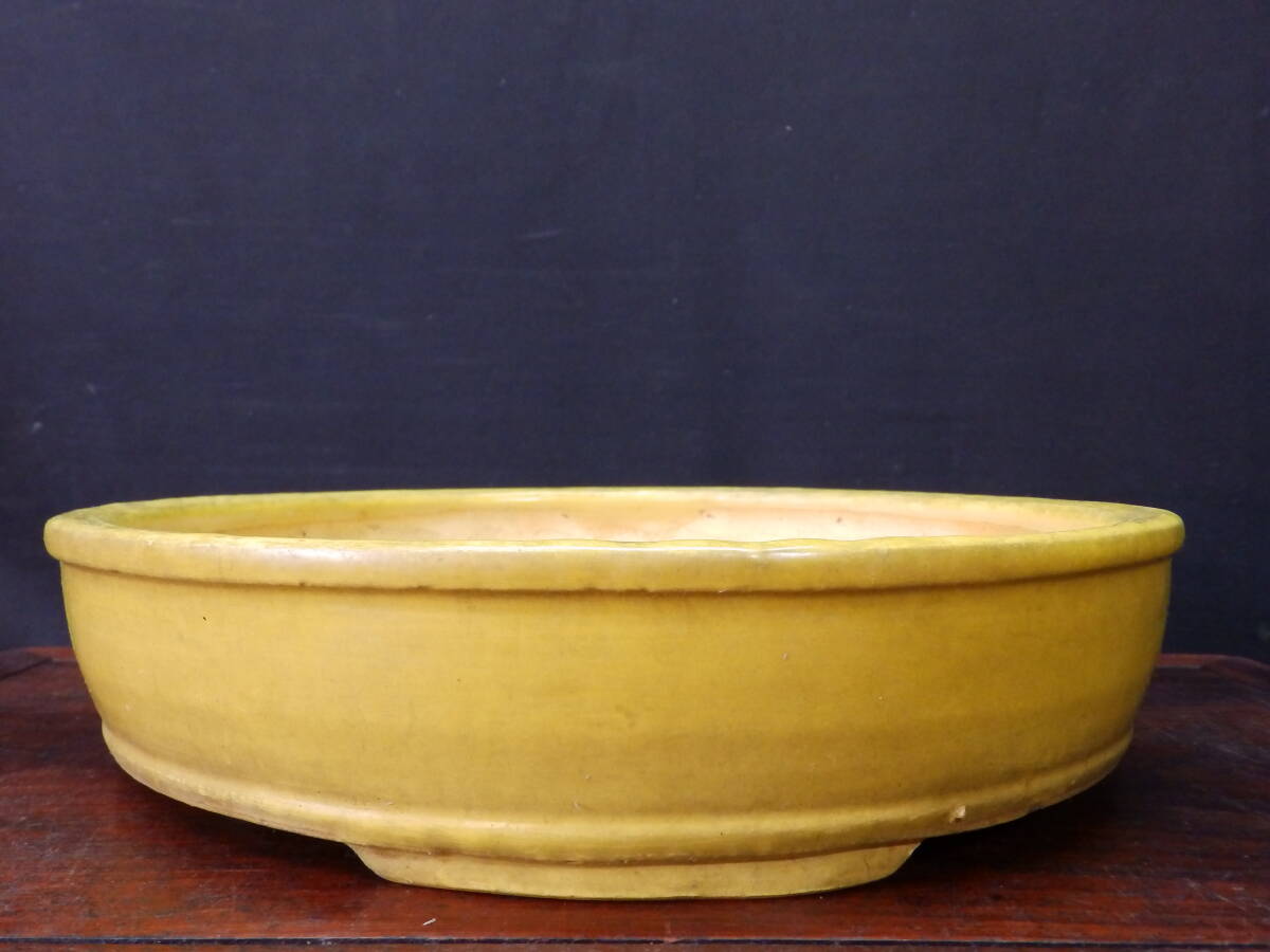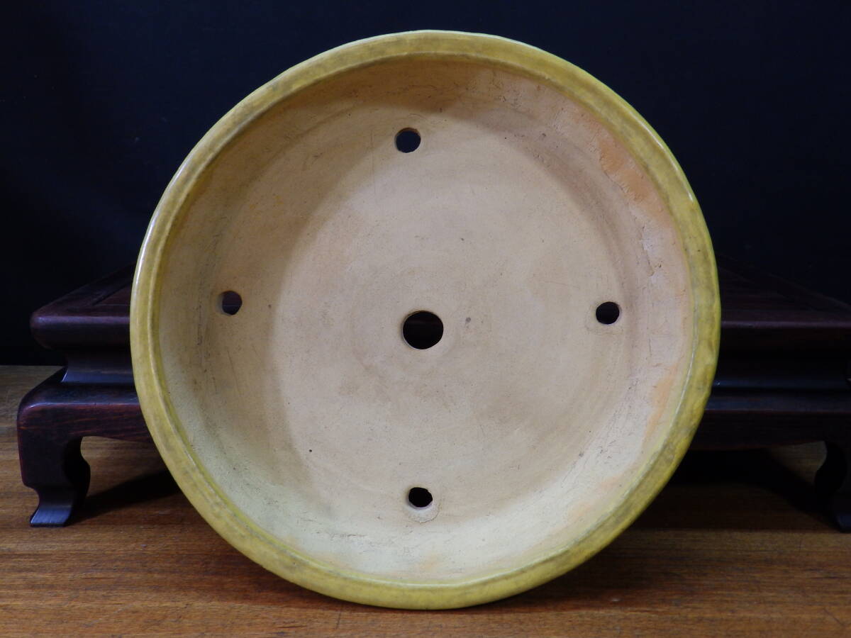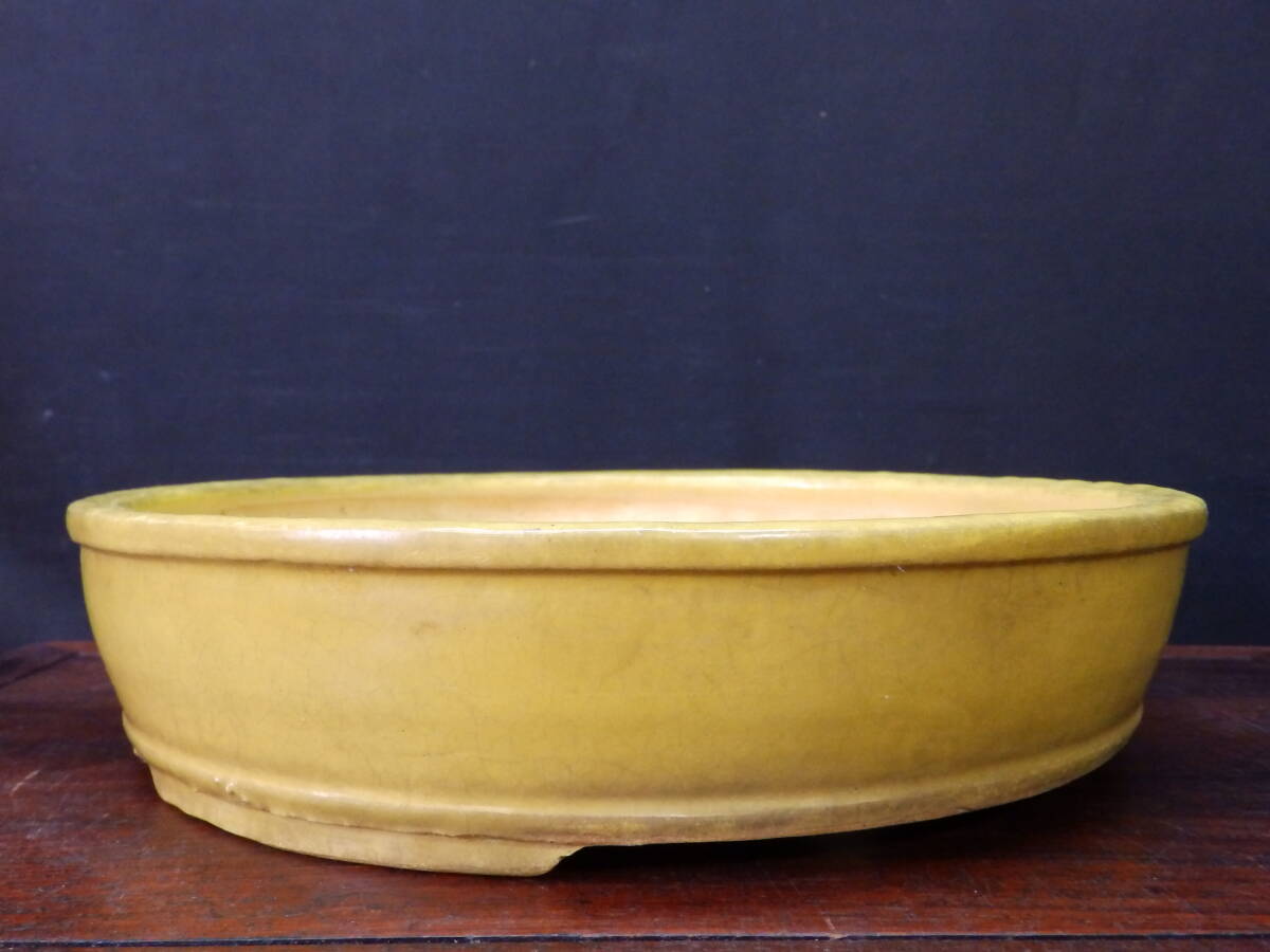 ★盆栽日和★ 和鉢 【義村秀峰】 黄釉上下帯丸鉢・手造り 27㎝
