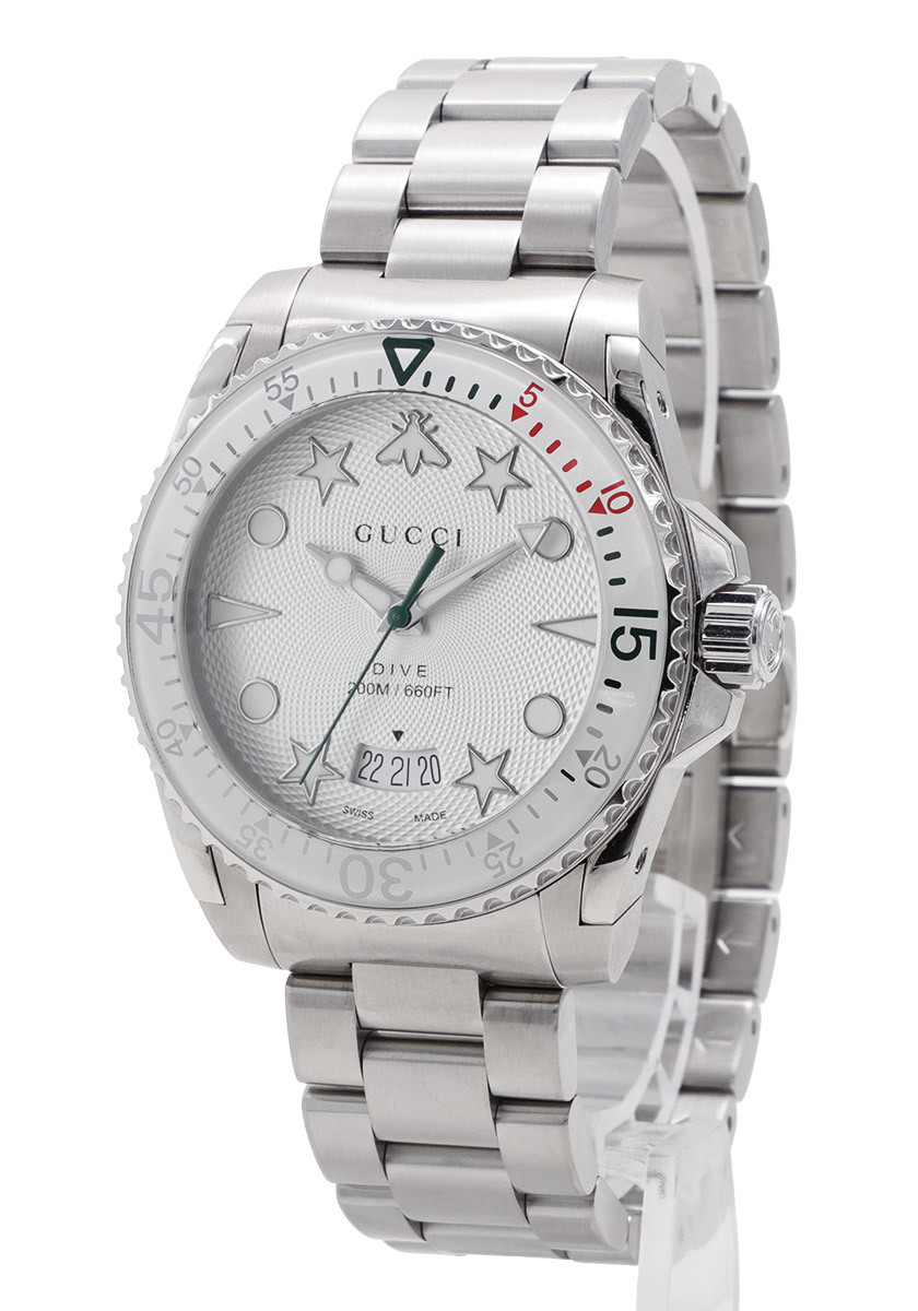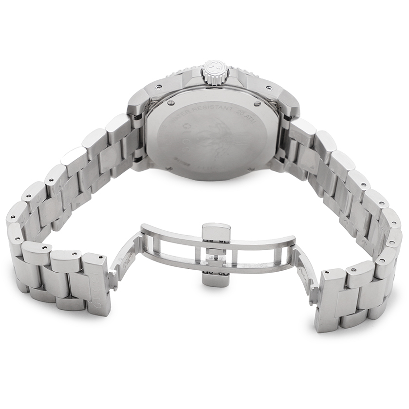 | 洗練されたギョーシェ文字盤に、ビー(蜂)、スター(星)のインデックスが遊び心溢れるグッチ人気のダイバーズモデル。クオーツムーブメントを搭載して6時のワイド窓に日付を表示し、指針&インデックスには蛍光塗料が塗布されて暗所でも視認性を発揮します。グッチのオリジナリティ溢れる個性的な表情とスポーティなデザインがオンオフ活躍して手元を格好よく引き締めます。 |