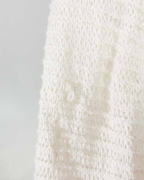 | ナチュラルな質感が素敵な春夏ニットボレロ。シャリ感のある麻混の糸をざっくりと編んだ、涼やかな1枚です。生成り調のカラーでコーデしやすく、ノースリワンピースやキャミにサラっと羽織れば、程よいぬけ感を演出するゆったりとしたお作りになっています。 |
