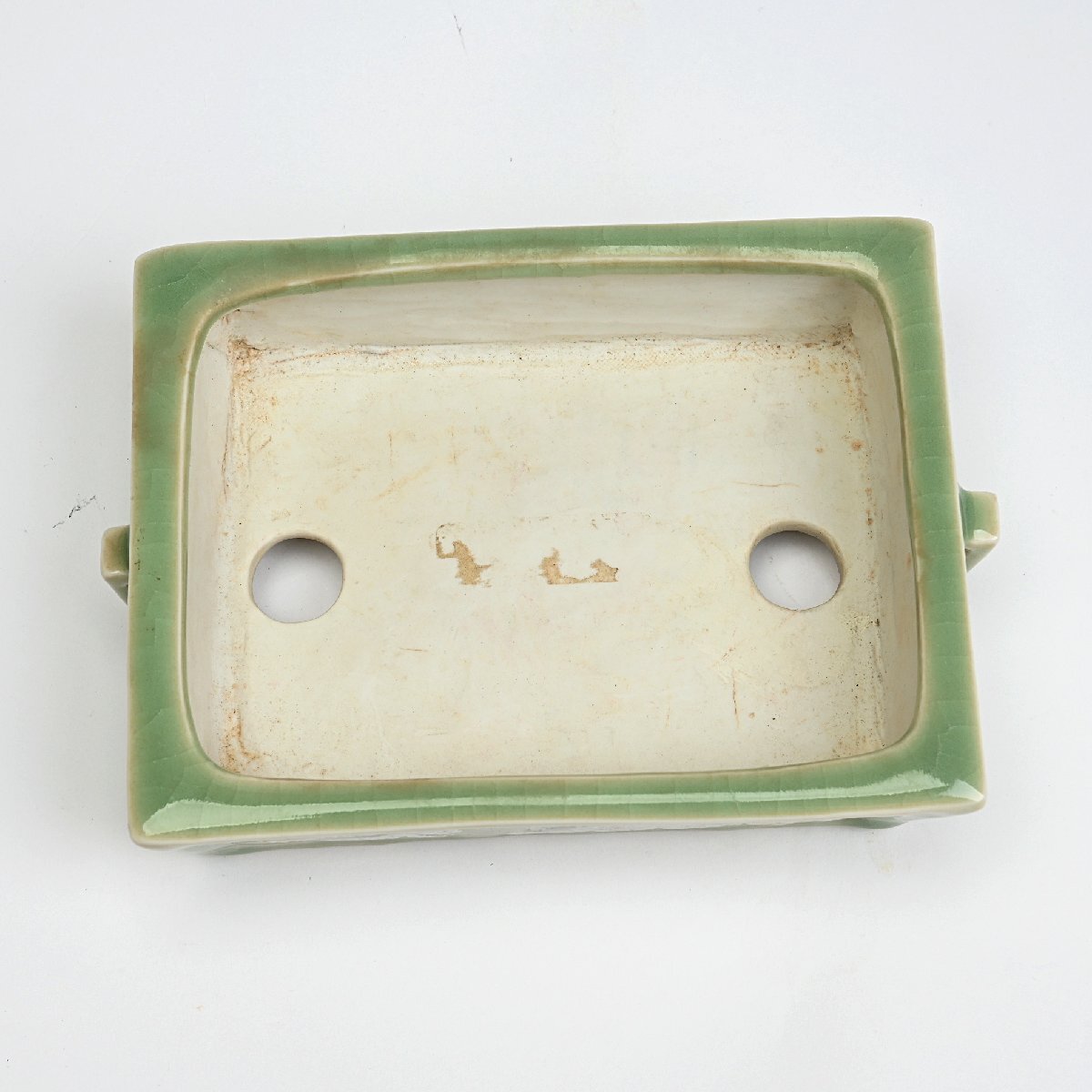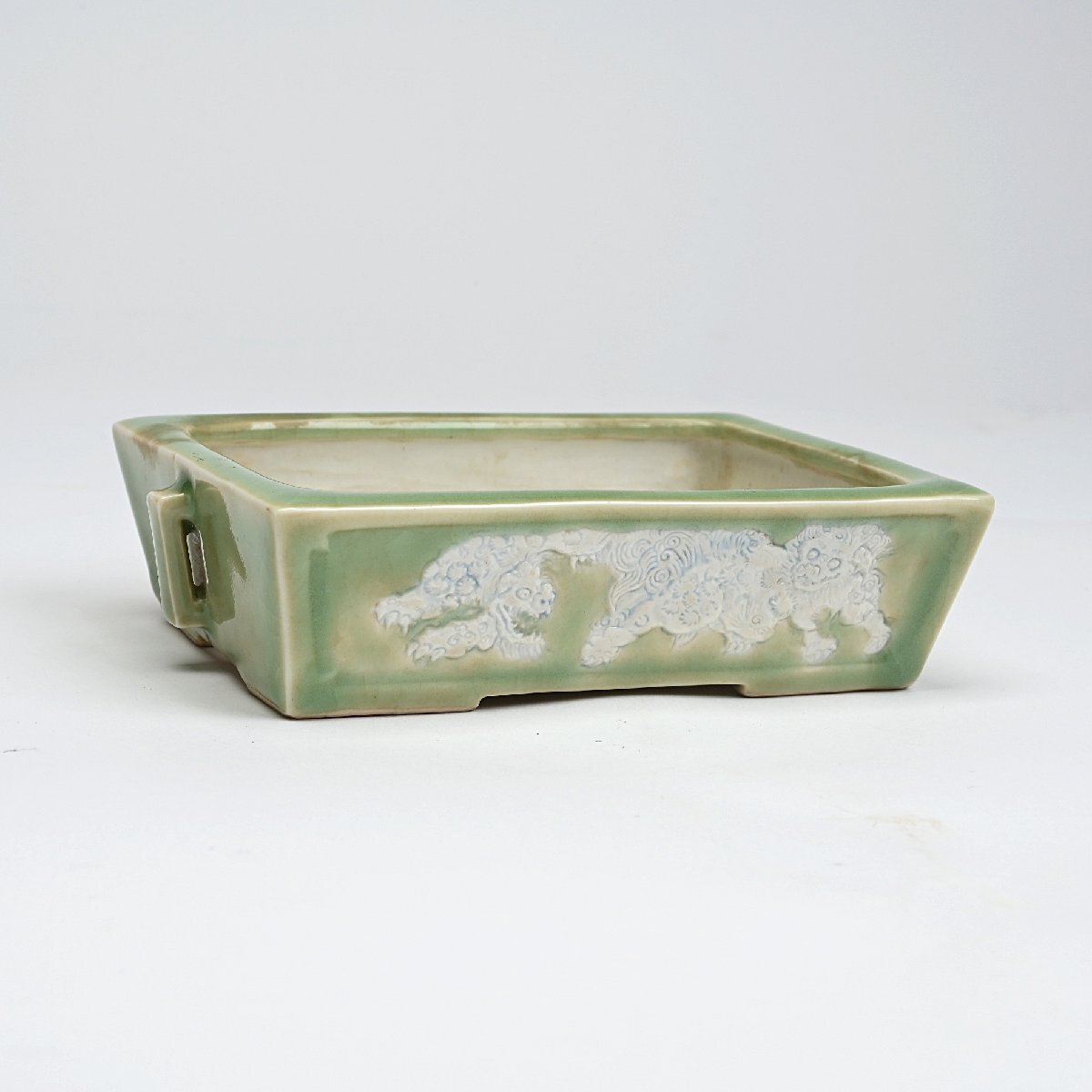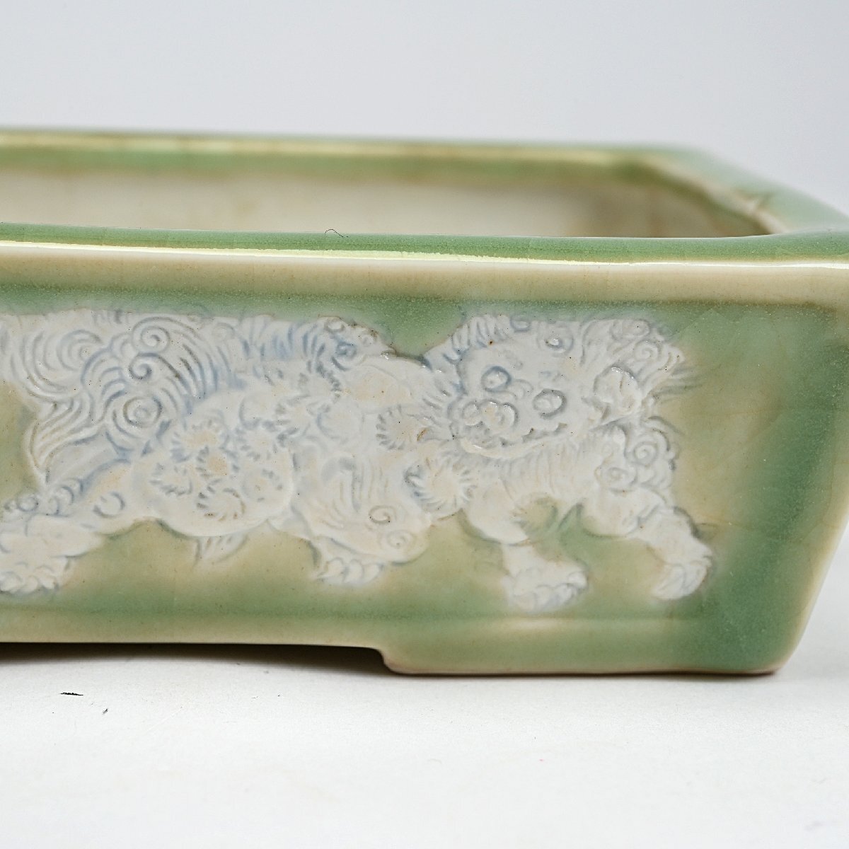 ITIL005 小品盆栽鉢 5 奥村宗山 造 湖東百閒橋 宗鳳園 青磁 七宝獅子文 耳付長方型