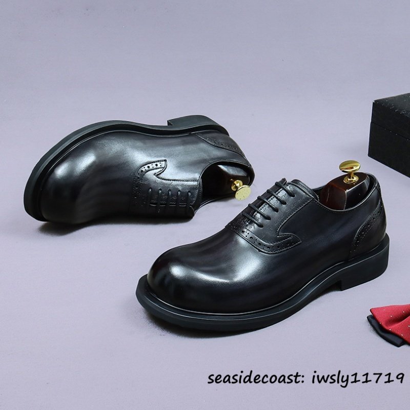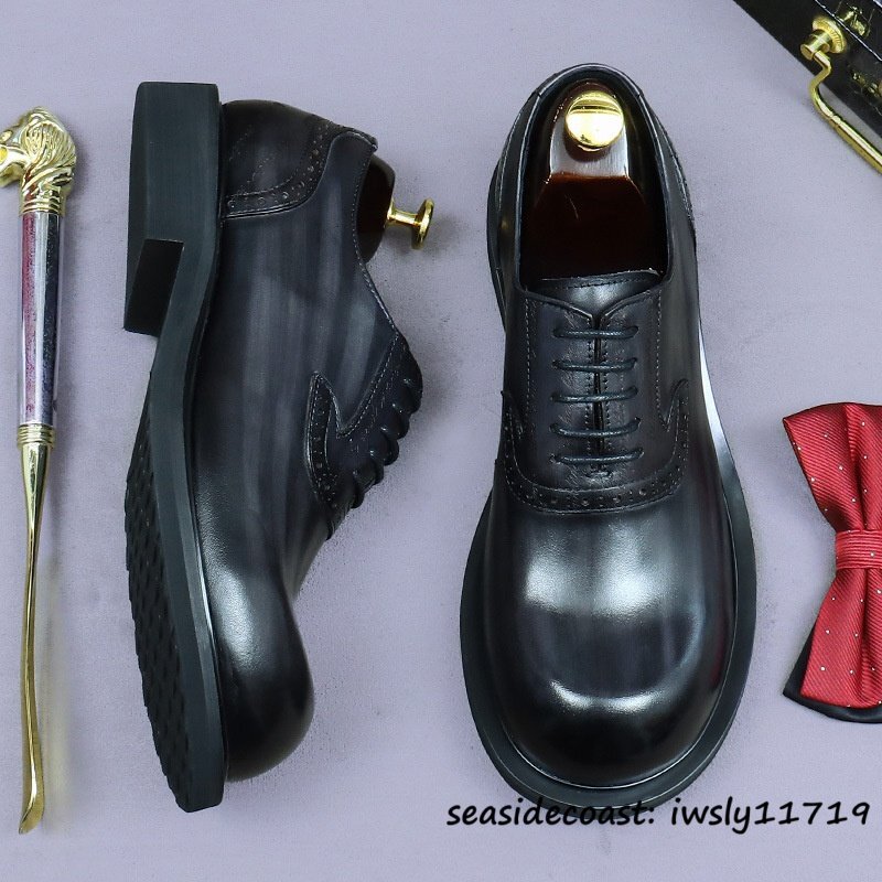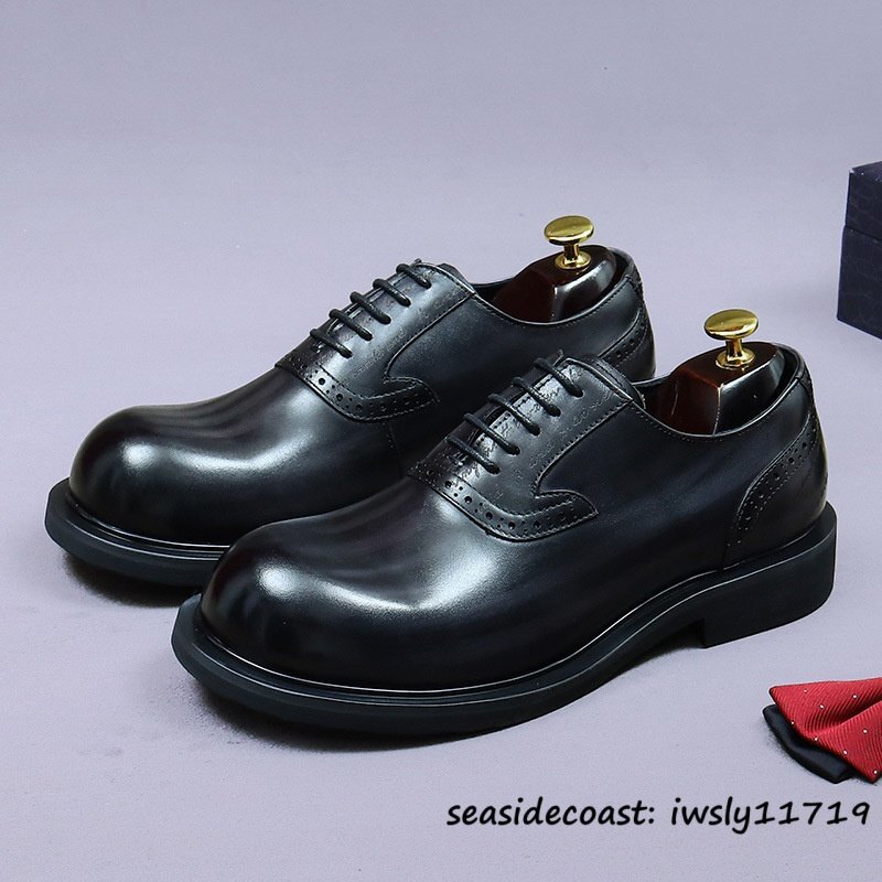 最上級◆定価10万 本革 ビジネスシューズ メンズ 本牛革 レザーシューズ 職人手作り 彫り 紳士靴 厚底 イギリス風 冠婚葬祭 グレー 27.5cm