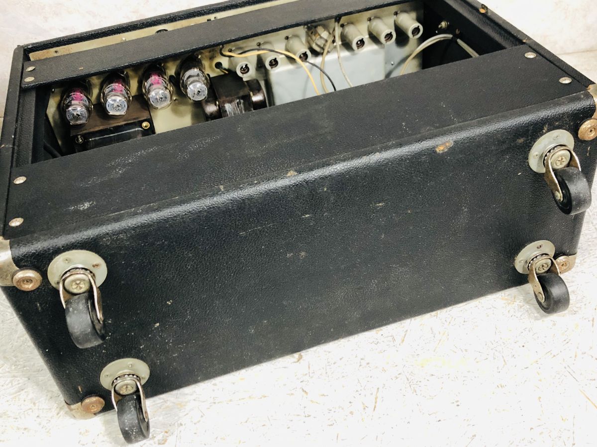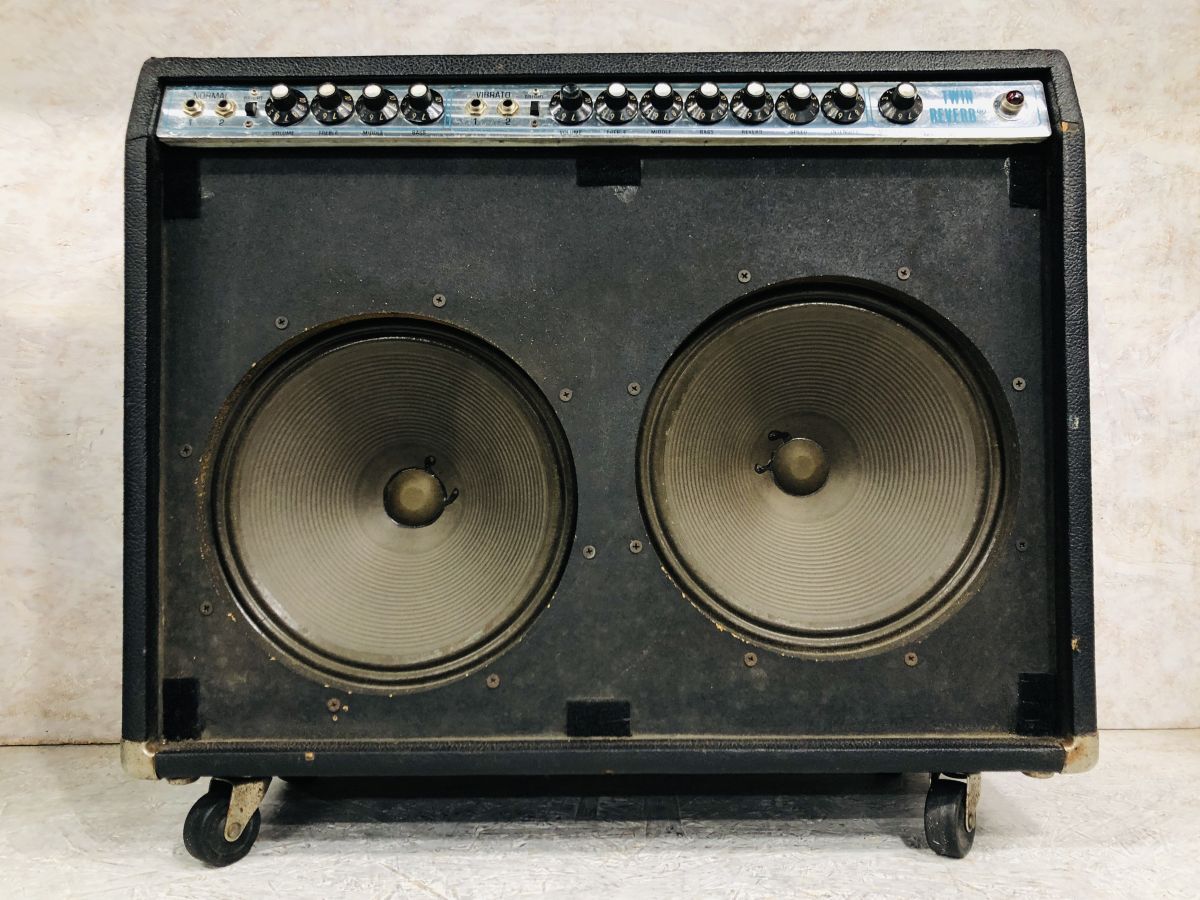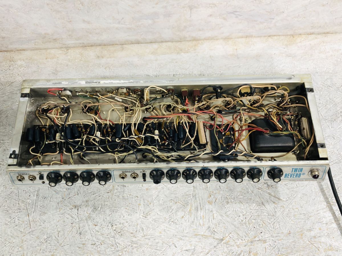 状態 : 年代相応の傷、汚れ、使用感があります。スピーカーネットに破れ箇所があります。気にならない程度のガリがあります。電源スイッチが交換されています。真空管が交換されています。パワー管がRUBY、他はまちまちです。オリジナルと思われるFenderのプリ管もありました。若干ハムノイズがでます。バンドで演奏する分には問題ありません。静かな曲をギター1本で、という感じだと気になるかもしれません。真空管の状態は不明ですが見た感じとても古そうです。前オーナーによると真空管を交換してから30年近くは経っているとのことです。現状で音量は十分出ています。リバーブ、トレモロも正常動作しています。現状お渡しとなります。