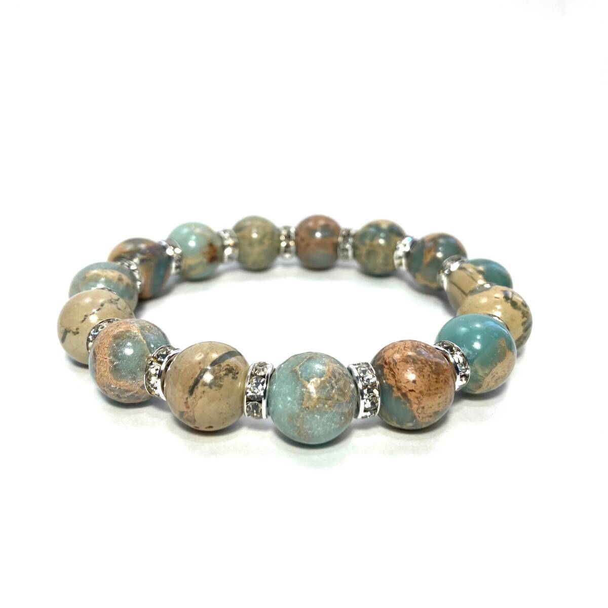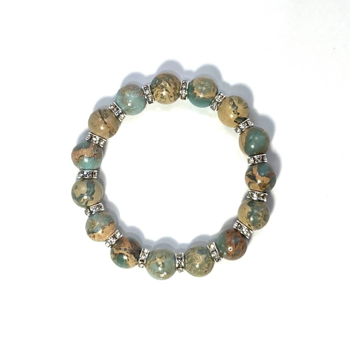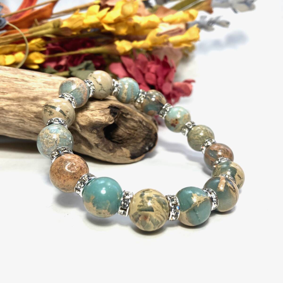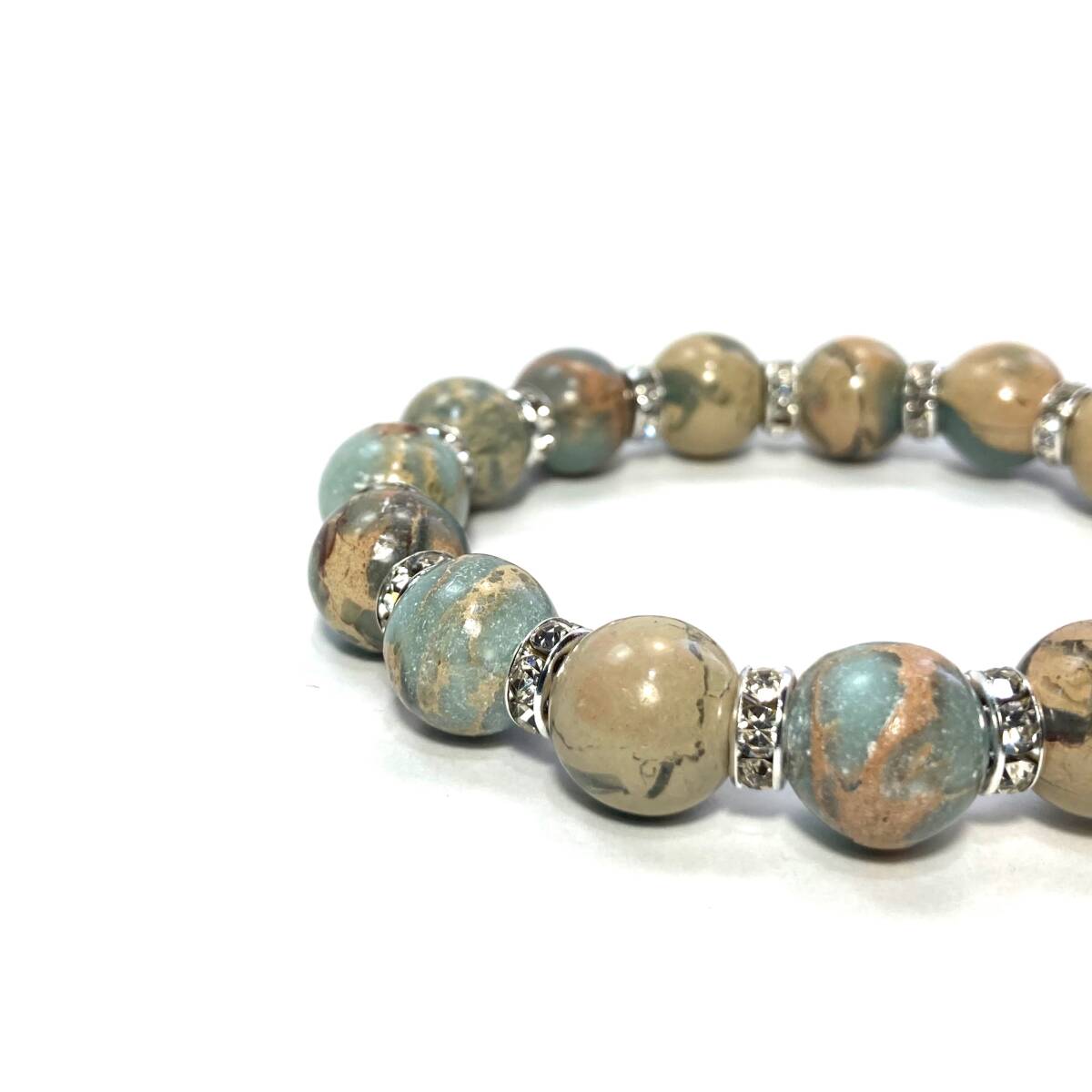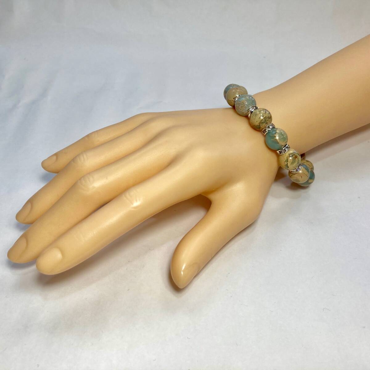 こちらは、12mm玉のインプレッションストーンを使用した天然石ブレスレットです。石との間にはロンデルを挟み高級感を演出しています。シンプルなデザインですのでどんなコーディネートとも合わせ易いブレスレットです。石大きさは12mm玉です。内径約18cmです。(サイズ調節も無料で承っています。サイズ変更の場合は購入後、メッセージをお願いします) 数に限りがございますので気になる方はお早めにどうぞ。