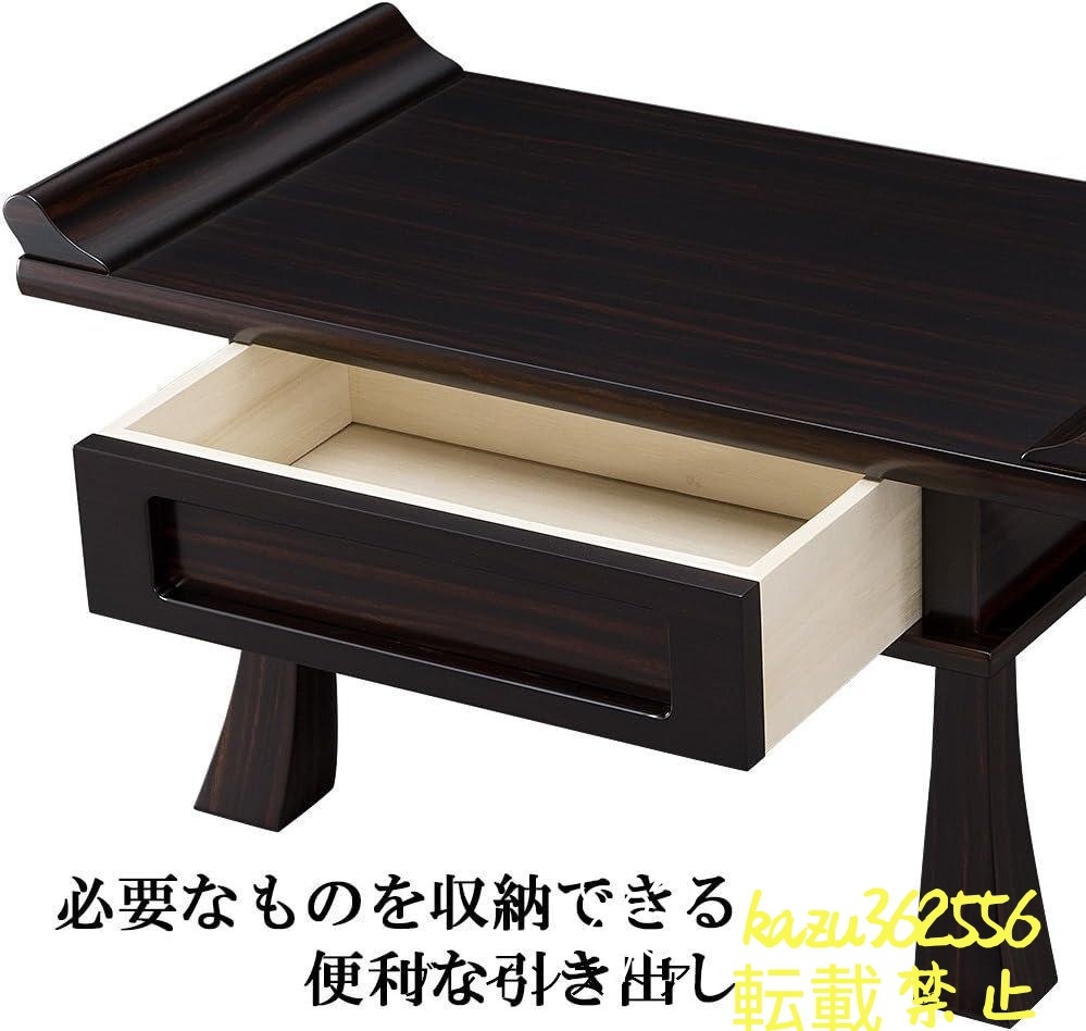 □商品詳細 ★状態 :新品 ★カラー:画像参照 ★商品詳細 ◆サイズ:42*30*24CM ◆材質:木 仏壇の前に置いて、香炉やローソク立、線香立、リン、数珠などを置いて使うと便利な経机です。シンプルなデザインと落ち着いた黒檀調の色合いは、どんなお仏壇にもよく合います。経机を使うと、身近なところで線香やローソクをお供えできるので、おまいりがしやすく便利で安全です。 毎日のおまいりに必要なローソクやお線香などを収納できる引き出しも付いています。引き出しには湿気や虫を寄せ付けない「桐材」を使用しているので、大切な仏具の収納に最適です。脚は簡単に組み立てができる差し込み式なので、使わない時はコンパクトに収納もできます。