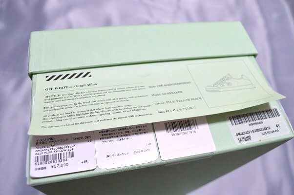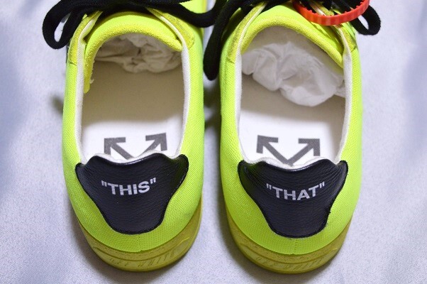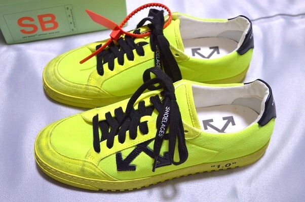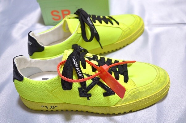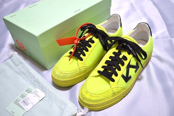 建築デザイナーからストリートラグジュアリーをコンセプトにファッションデザイナーに転身、黒人で初めてルイ・ヴィトンのデザインアンバサダーに就任するなど、類まれな才能に期待されるも若干40歳でこの世を去ったヴァージル・アブロー氏。彼が癌で急逝する12年くらい前に発売されたOFF-WHITEスニーカーです。随所にインダストリアルアイコンがあしらわれています。素材はコットンキャンバス、色は蛍光イエロー。一見コンバース等のクラシックスニーカーの様ですが、ラグジュアリーストリートだけあって実物はかなりしっかりした作りで高級感もあります。サイズは欧州4126.0cm相当ですが、つま先や足囲が大きくEE3Eくらいのゆったりめです。コンバースよりスケーターシューズのイメージかもしれません。汚れて見えますが、DISTRESSEDという汚し加工です。原宿ヌビアンで新品購入した日本正規品です。履くつもりで部屋で紐を通して試着しましたが、当方私服の機会が減り、結局未使用のままクローゼット保管しておりました。外箱に少し汚れがあります。赤いジップタブは実用には裾と干渉して邪魔だと思いシューレースに付け直してあります。もったいないのでどなたかお譲りします。発送はヤマト運輸宅急便の着払いのみとさせていただきます(申し訳ありませんが他の発送は致しません)。関東より80サイズで発送予定です。個人出品の為、ノークレーム・ノーリターンでお願いいたします。※新規IDおよび、お取引が遅い方、受取連絡をしない方、キャンセル歴が多い方、入札代行業者および転売ヤーは入札を一切お断りさせていただきます。新規IDおよびキャンセル歴の多い方、入札代行業者および転売ヤー、24時間以内にお取引開始していただけない方、その他当方主観で怪しい方は落札者都合で削除させていただきます。お互いに誠実で気持ち良いお取引を希望します。