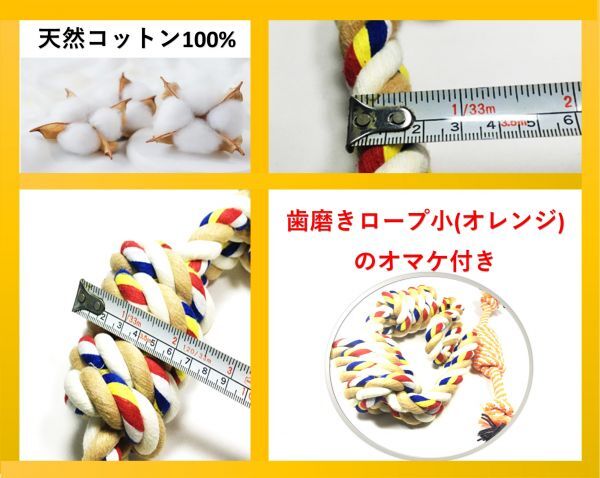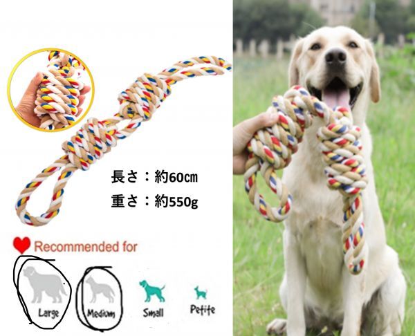 マルチカラーロープ:2ノット 長さ約60 cm 結び目:直径約8㎝ 重量約550g+(子犬用歯磨きロープ)