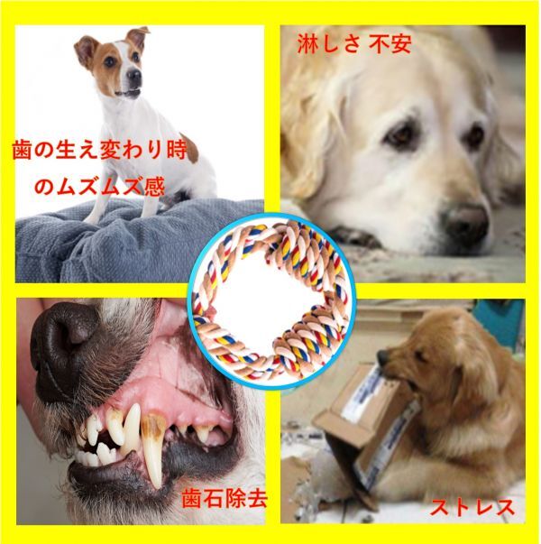 生え変わりの時期は、口の中がムズムズしたりしますが、ロープを噛むことで、落ち着き、安心できます。お留守番の多いワンちゃんは、噛むことで、満足感が得られ、不安や淋しさを減少することができます。