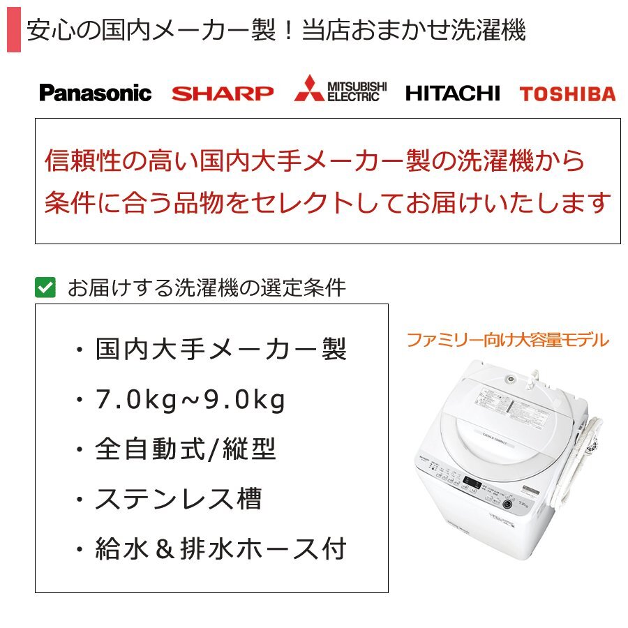 | 製品の特長 | ・安心の国内大手メーカー限定!当店おまかせファミリー向け大容量・全自動洗濯機 ・容量7.0kg、ノンインバータータイプを中心にセレクトいたします。 ・当店おまかせのため機種やカラーの指定はできませんが、そのぶんお買い得です! ・動作確認&クリーニング済みのため、届いてすぐにお使い頂けます。 ・長期90日の動作保証付きだから、万一の故障の際も安心です。 |
