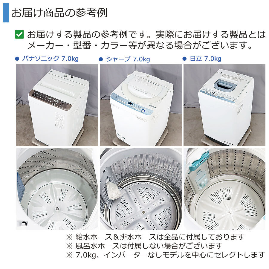 | コメント | ファミリー向け大容量の、当店おまかせ洗濯機! 容量7.0kg、ノンインバーターモデルを中心に当店在庫からセレクトしてお届けします。 |