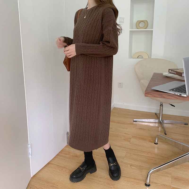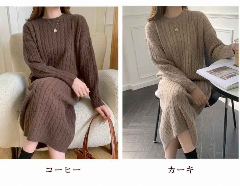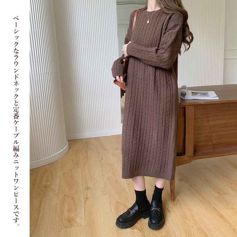 ・ベーシックなラウンドネックと定番ケーブル編みニットワンピースです。