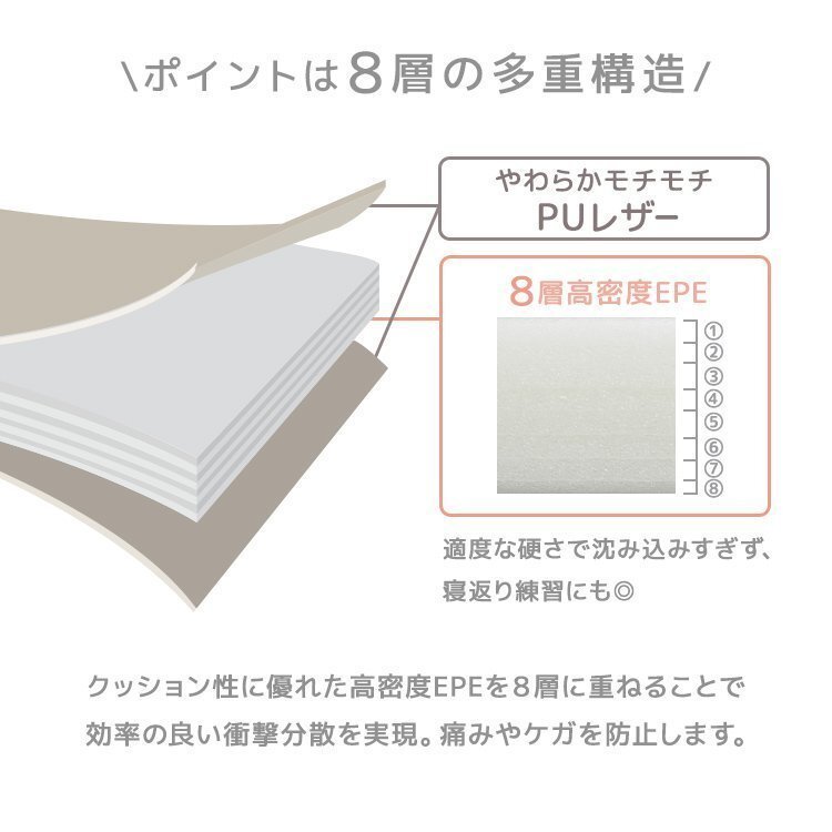 \広々、安心!ワイドサイズ/ 思いっきりジャンプ、思いっきり遊んでも大丈夫! 赤ちゃんの安全に遊べるスペースや寝返りマットとして、元気なお子さまがいるご家庭のプレイマットとして大活躍! 柔らかすぎずちょうど良い硬さで、衝撃吸収はもちろん、軽くて弾力があり、お子様が転んでしまっても、痛みやケガを防止します。 また、お子さまがお家の中で元気いっぱいに遊んだ時の気になる騒音もしっかり吸収します。 リビングでのお昼寝スペース、オムツ替えマット、ハイハイマット、ベビージム、プレイジム、クッションマット、ラグマット、体操マット、トレーニングマット等、様々な用途でお使いください♪ 本製品は、ホルムアルデヒド検査基準と染料検査に合格したこだわりの製品仕様となっているため、小さなお子さまにも安心してお使いいただけます。 【商品仕様】 カラー:ラテ × アイボリー サイズ:(約)140×200×4cm(4段1枚) 折りたたみ時のサイズ:(約)140×50×16cm 重量:(約)4kg 素材:ポリウレタン、発泡ポリエチレン |