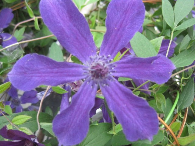 深い紫の整った花弁で花芯が黒っぽく、目を引く美しい花