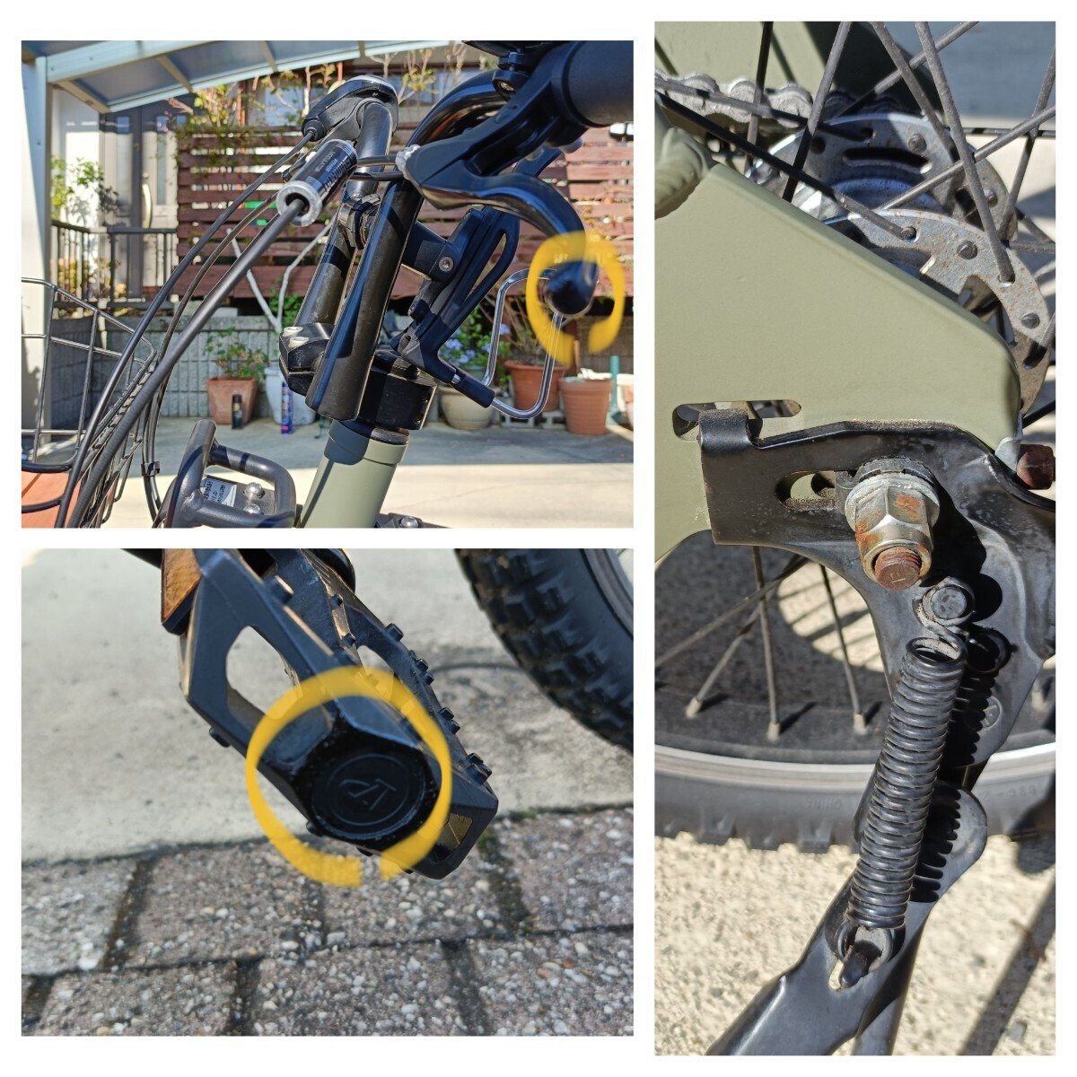 台風時に倒れないように寝かせてたところ、強風で車体が回転してしまい左ペダルの先と左レバーの先に小傷が付きましたので目立たない様にタッチアップペンで処理してます(画像8)