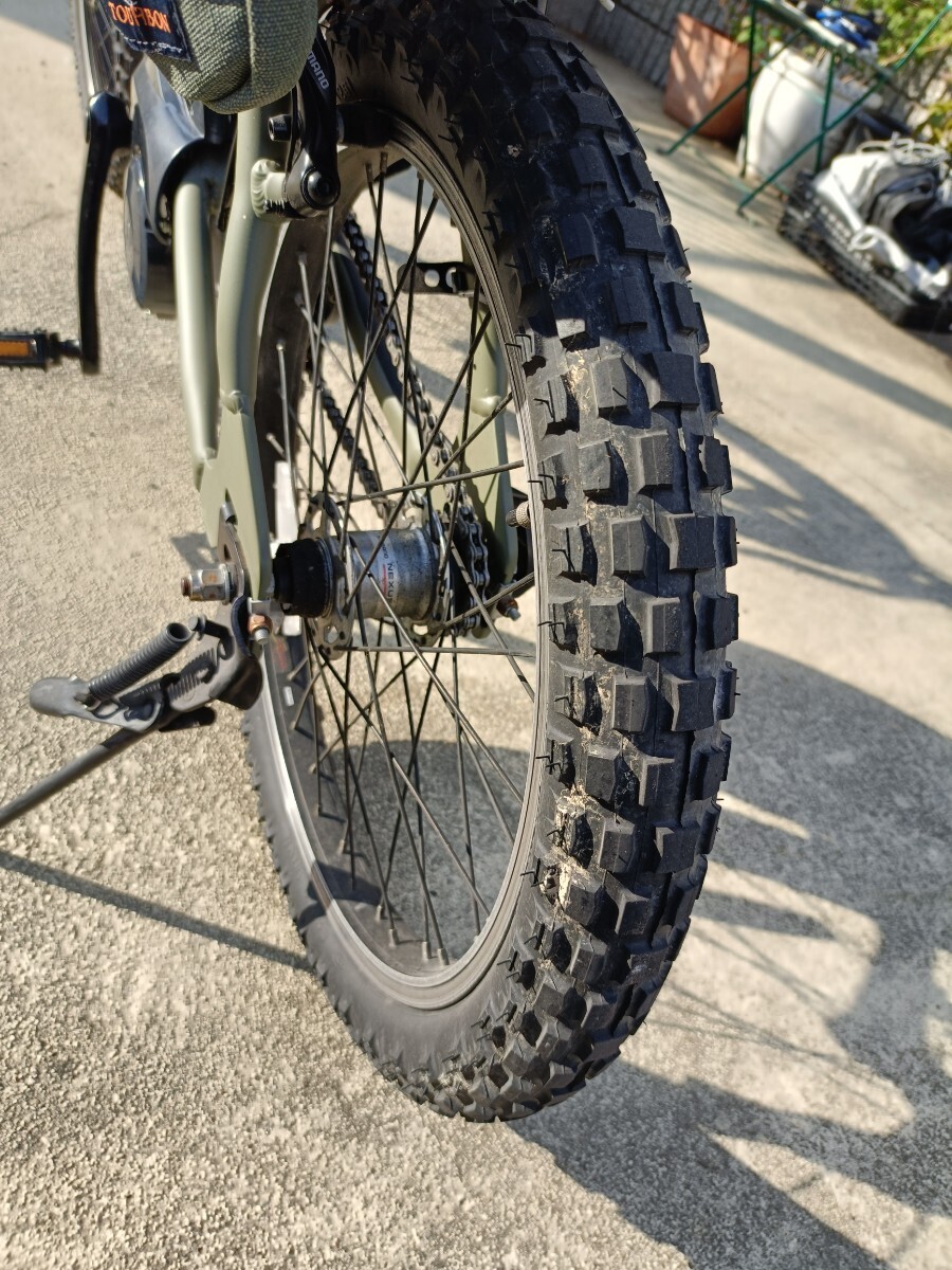 極太のブロックパターンタイヤを装備し、高い走破性と安定感を実現。