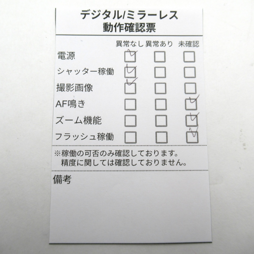 | 動作確認 | ■通電確認済み ※現状品 電源がつくことが確認できております。 詳細な操作の確認は行っておらず、今後の使用を保証するものではございませんことをご了承ください。 ■シャッター確認済み ※現状品 シャッターの稼働が確認できております。 詳細な操作の確認は行っておらず、今後の使用を保証するものではございませんことをご了承ください。 |