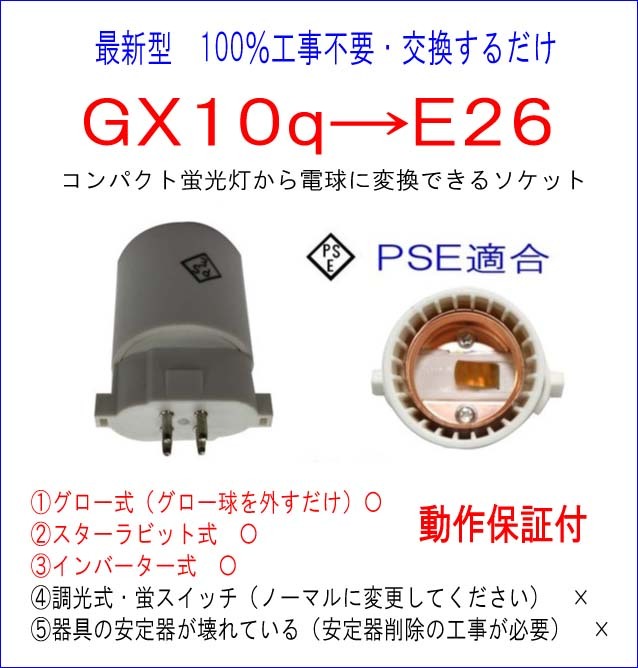 | 2025年最新型■100%工事不要■PSE適合■GX10q(完全対応)→E26変換ソケット 品番KS-GX10q-E26 適合 FPL4 FPL6 FPL9 FPL13 FDL9 FDL13 FDL18 FDL27 FHSD11 FHSD15 FHSD20 FUL6 FUL9 FUL13L FML9 FML13 FML18 FML27 FML36 FML55 |