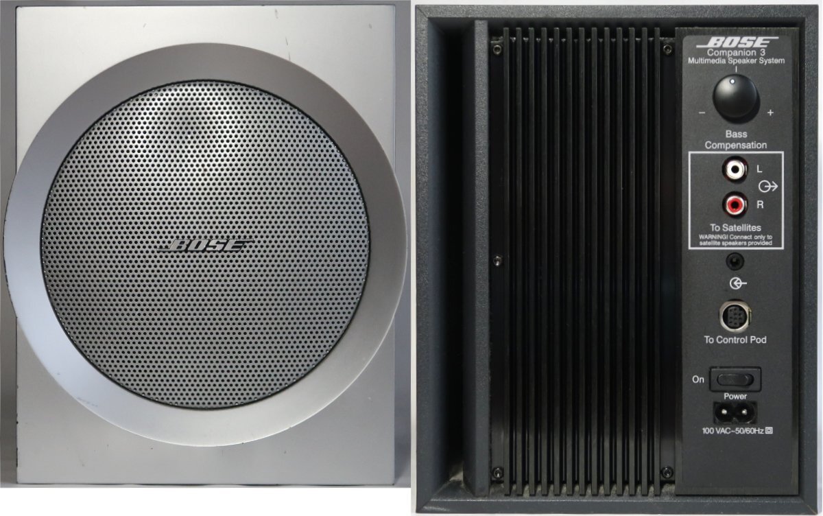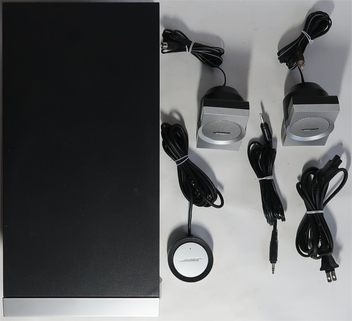 性能はWEB上でお調べください。出品は画像の物が全てです。他に必要なものがあればご自分でご用意ください。使用品ですので汚れや擦り傷があります。メインのスピーカーネットに凹みあります。私が持っている機器を接続してテストしました。ホイールコントローラーの接触が不良です。コントローラーの先端のタッチ式オンオフボタンはオンにはなります。電源オン後にスピーカーやコントローラーの電源は入りますが、音出しや音量調整用のコントローラーを適当な角度にしておかないと音が出ません。私はこのコントローラーを斜めに置いたり、縦に置いたり、コントローラーの配線の角度をなん度も変えてみたりを繰り返してなんとか音が出る角度にしてテストしました。変えている間には急に繋がったりするので爆裂音もします。きちんと繋がって音が出ている時はコントローラーの音量調整もできました。音が出ている時はメインとサブのスピーカーからきちんと音はでました。基本的にはコントーラーの接触が不良で音がでないと思ってください。コントローラーのどこが接触不良なのかわかりません。分かることは以上です。このような状態ですのでお取引後はいかなる理由がありましても返品はできませんし、クレームはおうけできません。