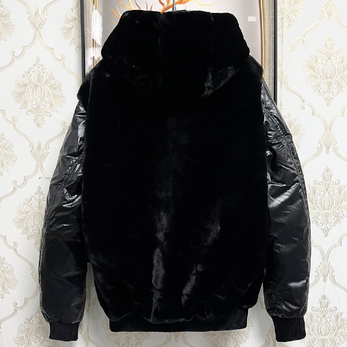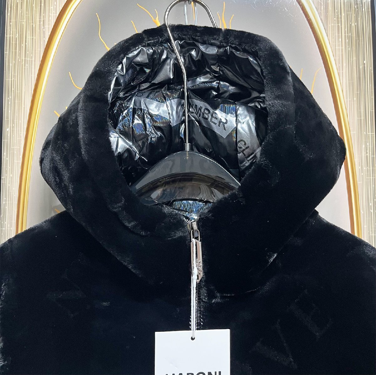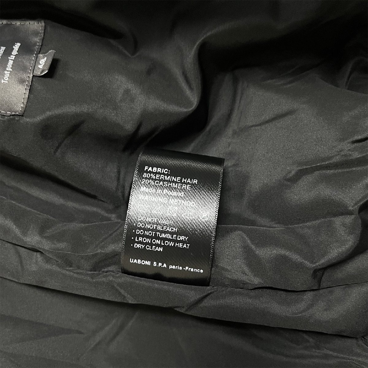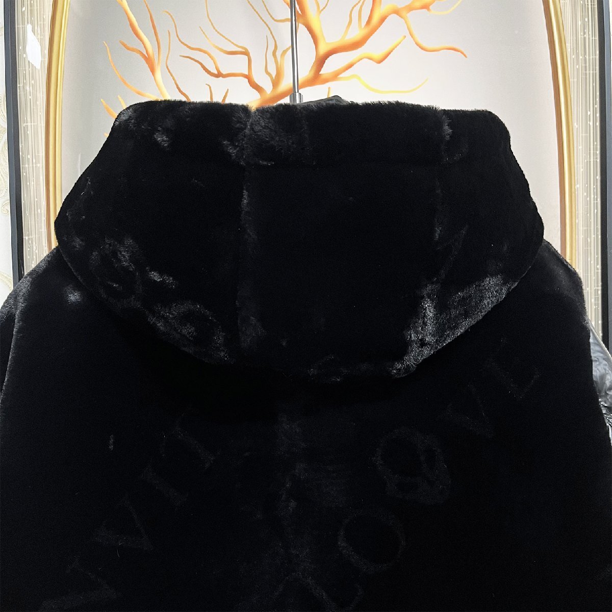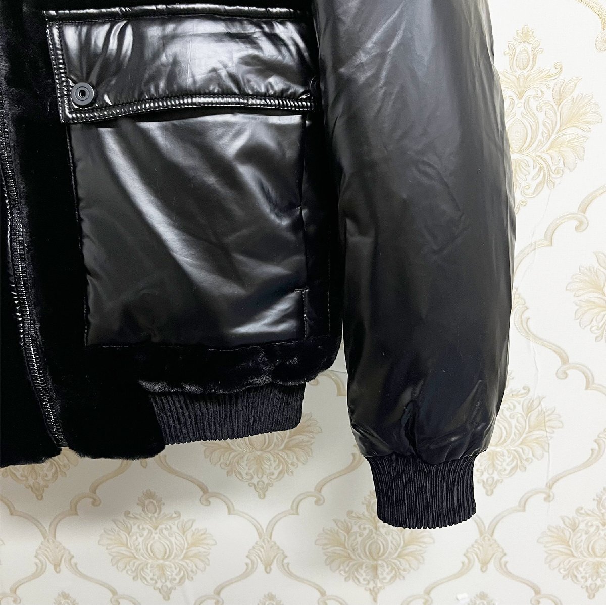 本体とフード部分は柔らかなファーで構成されており、手に触れた瞬間に上質さが感じられる贅沢な仕上がりとなっています。アーム部分やポケットに切り替えられた光沢感のある素材が程よいアクセントになり、コントラストの効いたモダンな印象を与えます。正面にはフラップ付きのポケットが2つ配置され、機能性とデザイン性の両方を高めています。シルエットはスタンダードで着回しやすく、スタイルを選ばずコーディネート可能。
