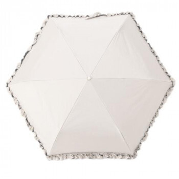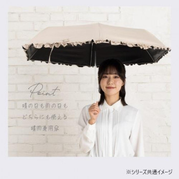 | 雨の日でも晴の日でも使えるレディース雨晴兼用折傘。手開きタイプです。裾のフリルや持ち手の極小ラメが可愛い、女性らしいデザインです。 |