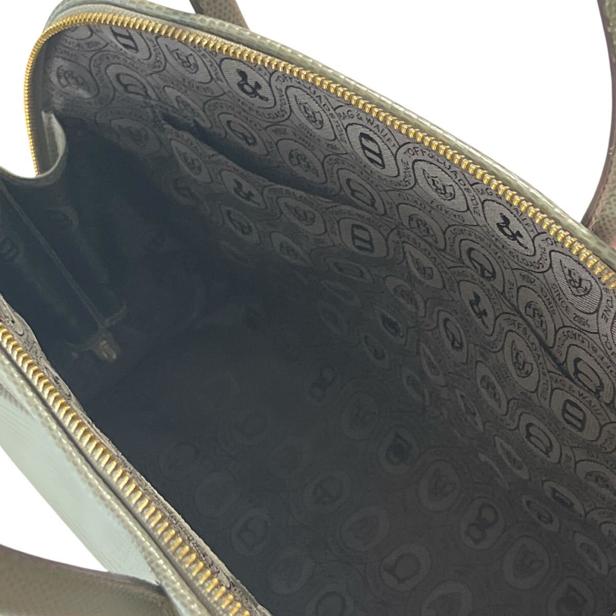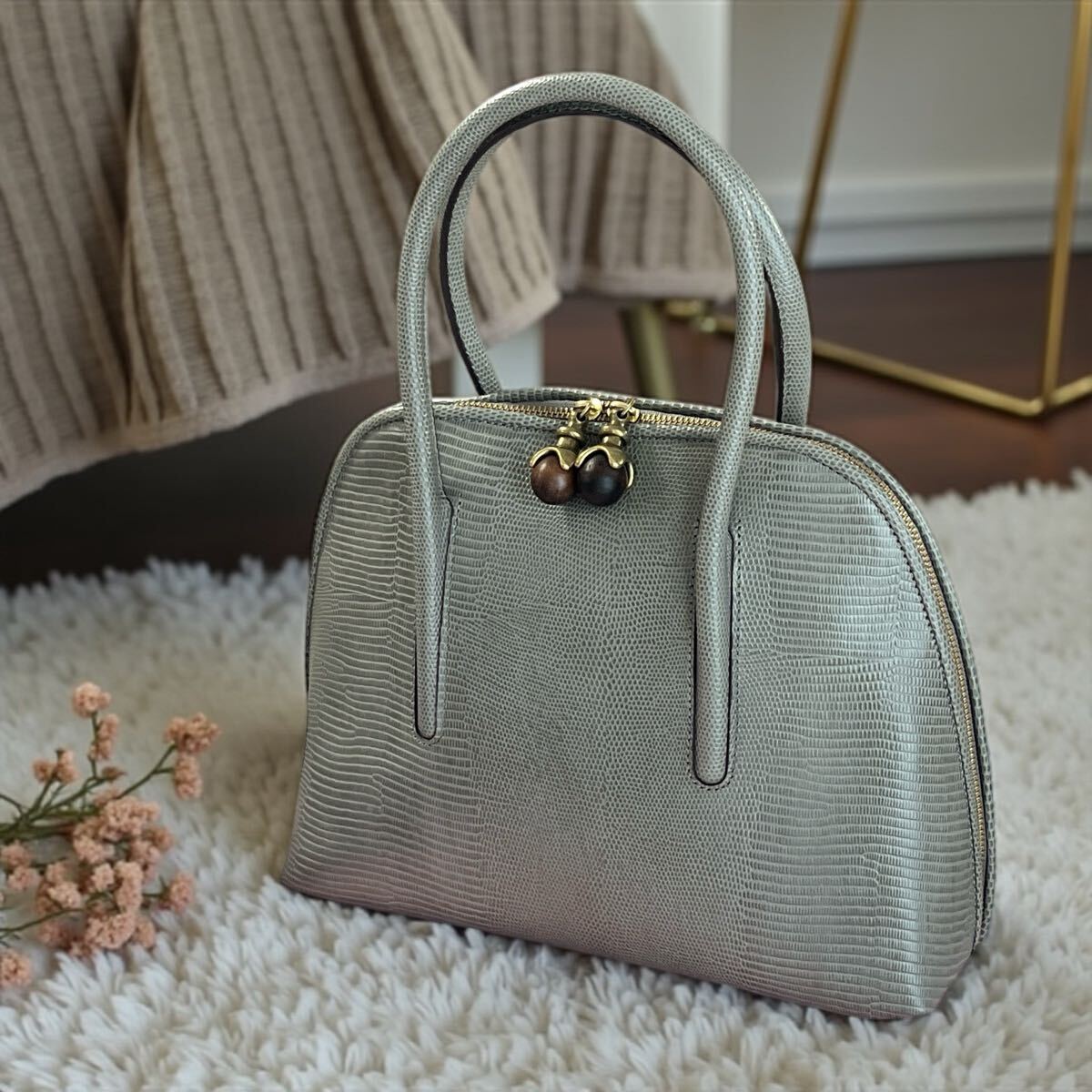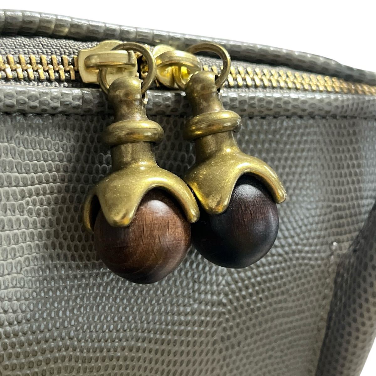 ファスナーの引き手が上品で、リザード型押しレザーの質感がとても美しいバッグです。