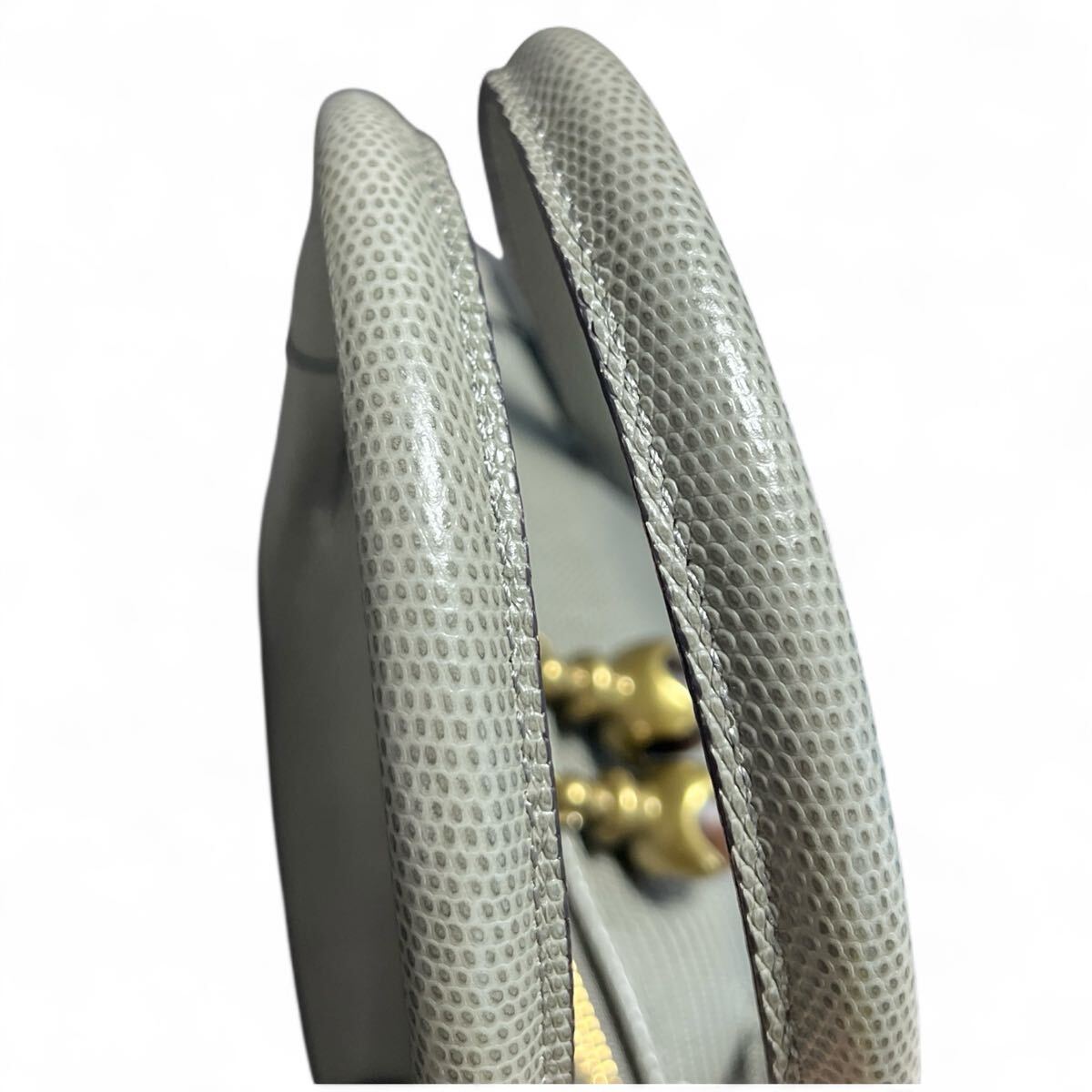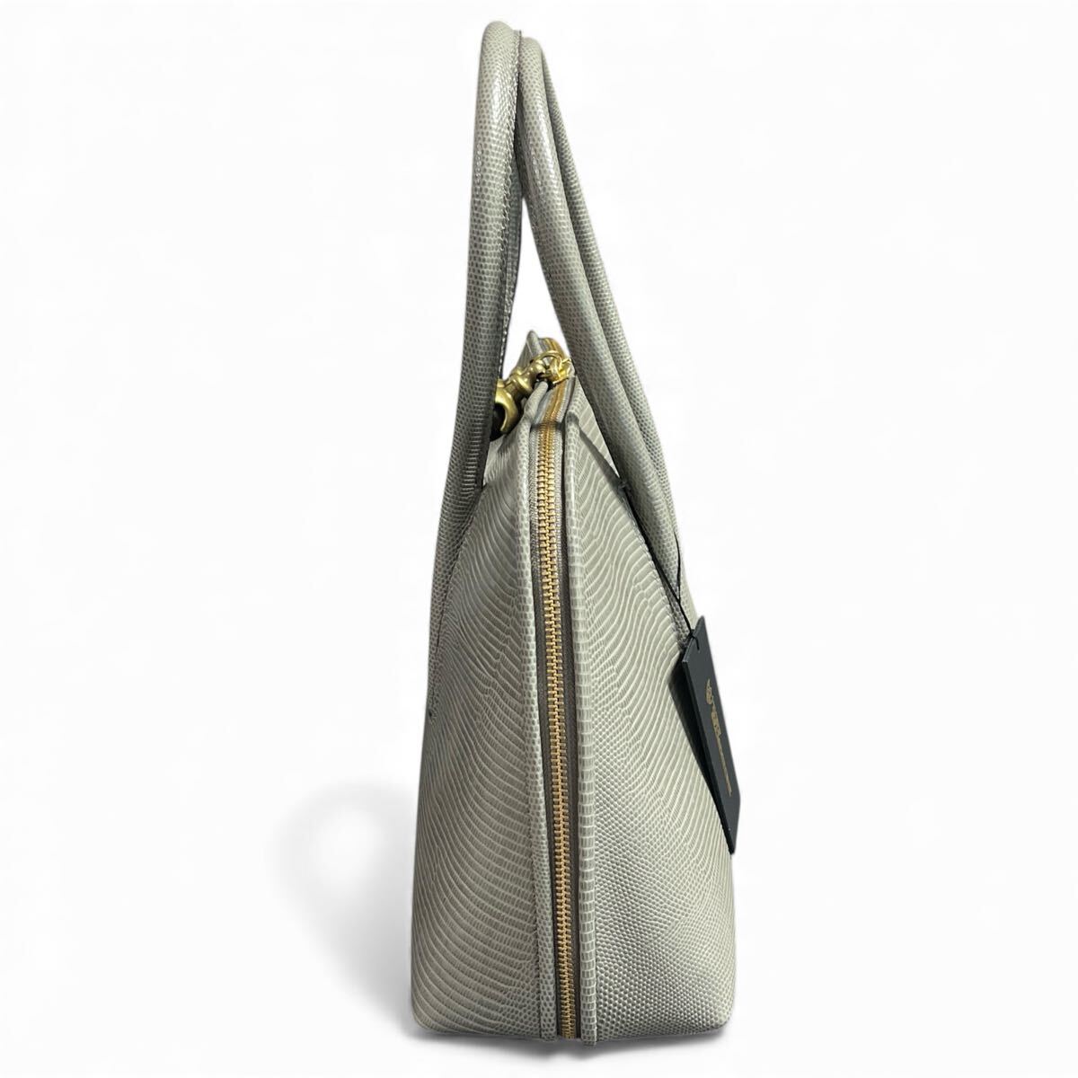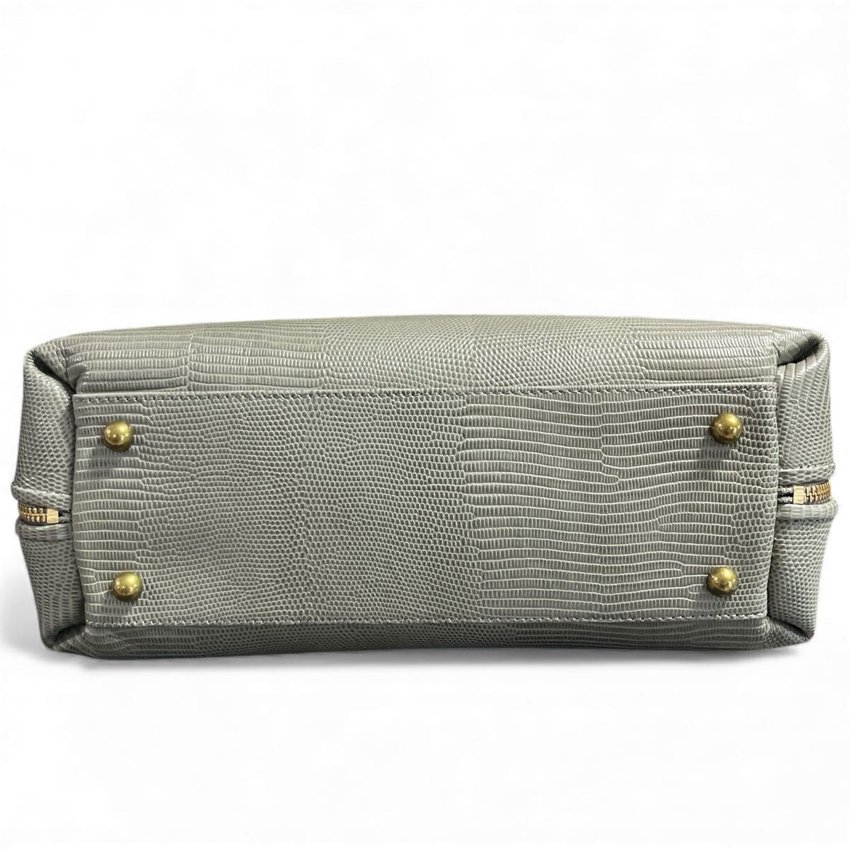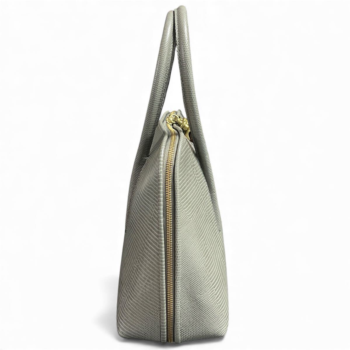 ファスナーの引き手が上品で、リザード型押しレザーの質感がとても美しいバッグです。