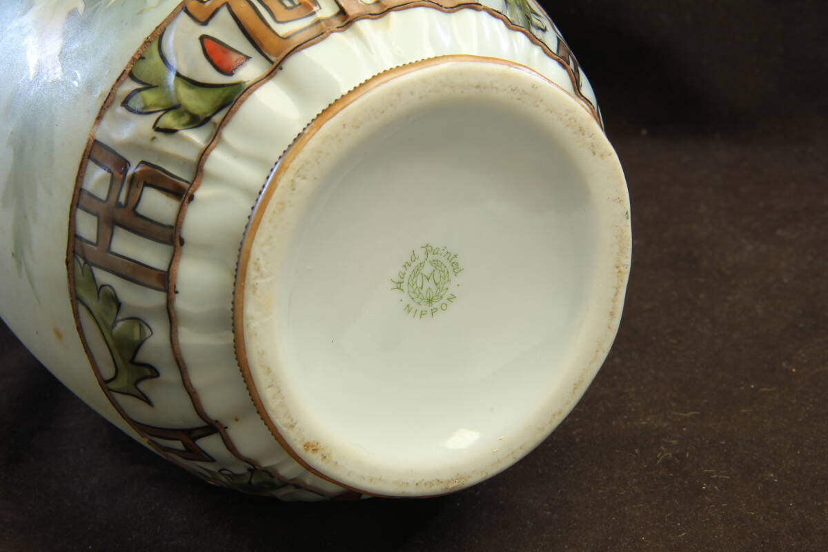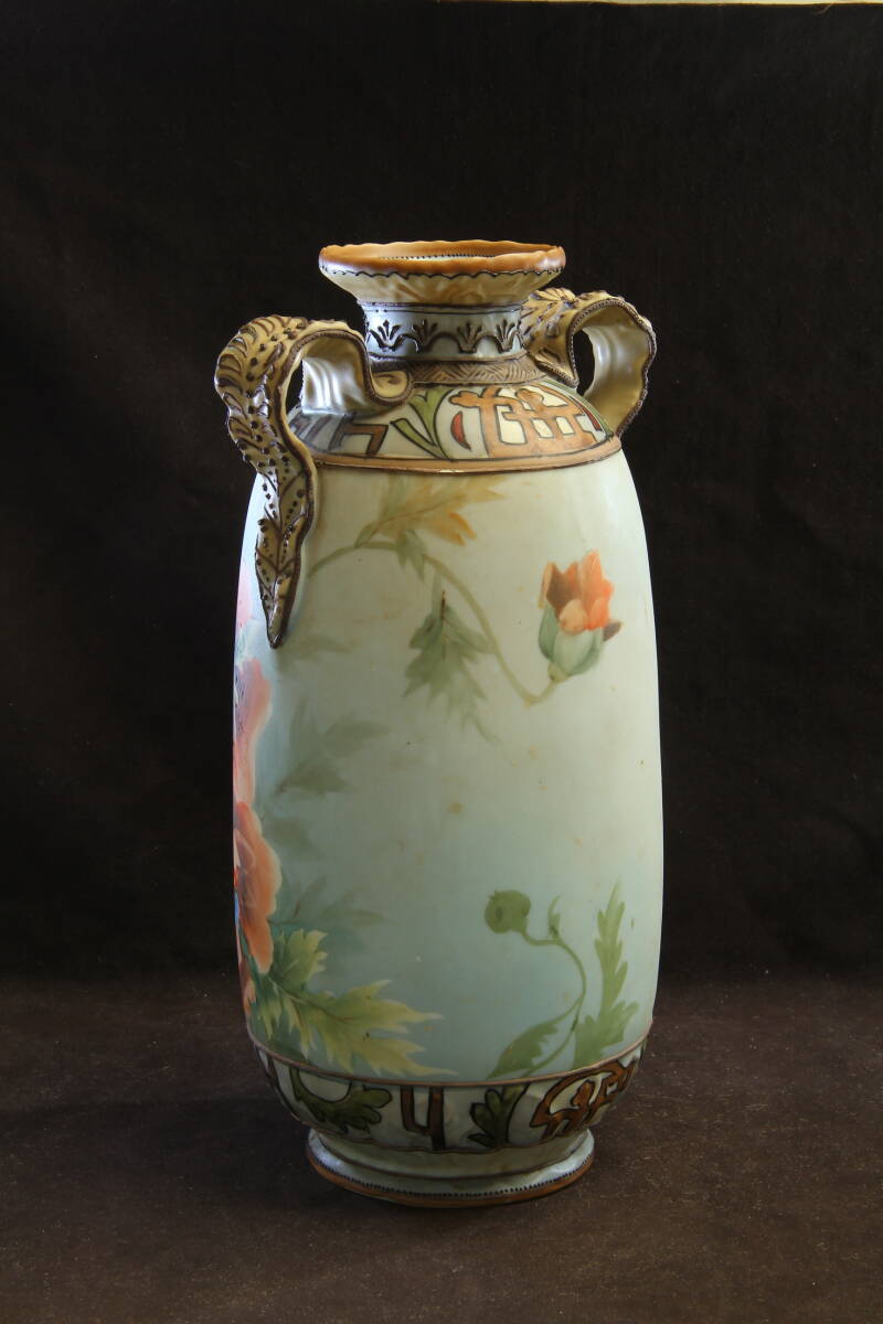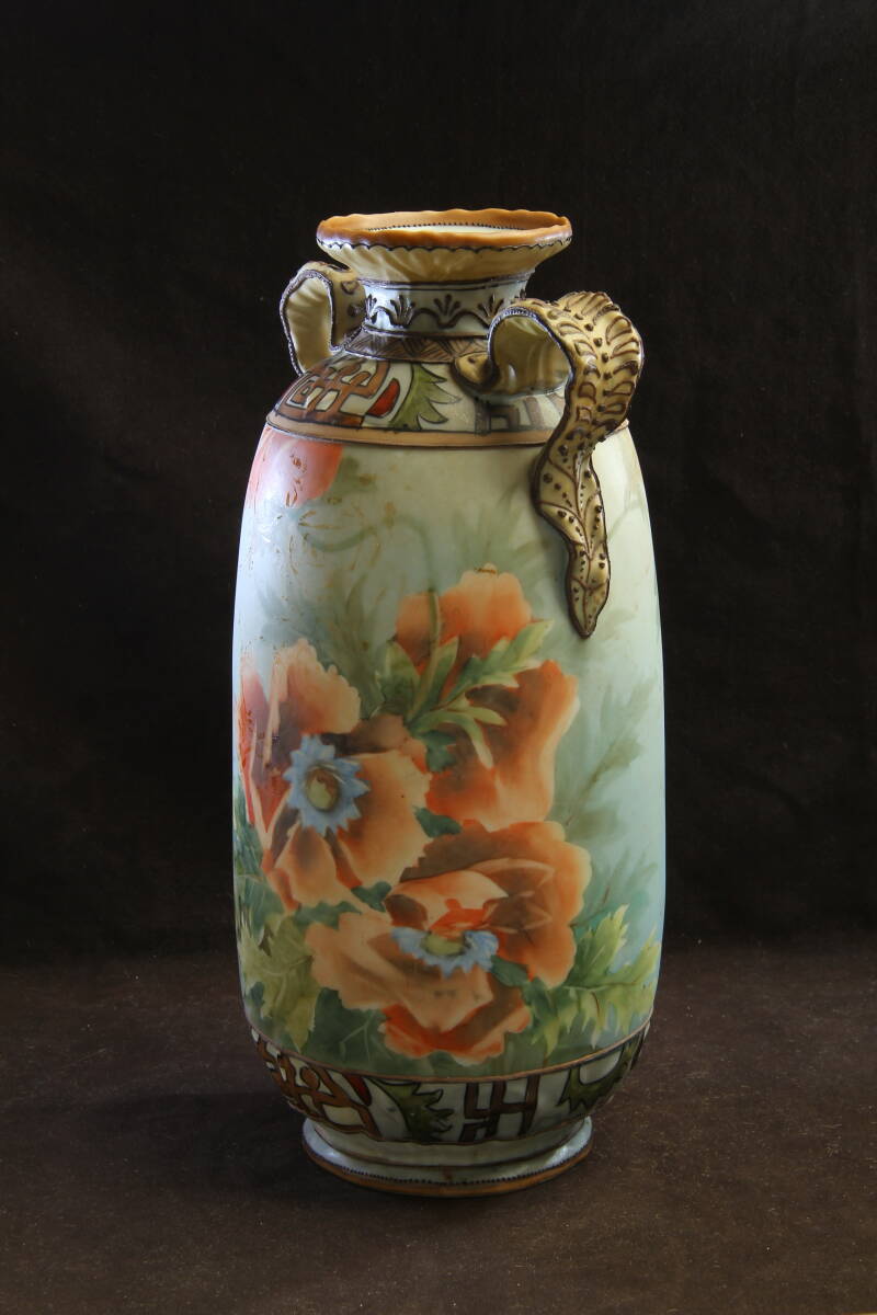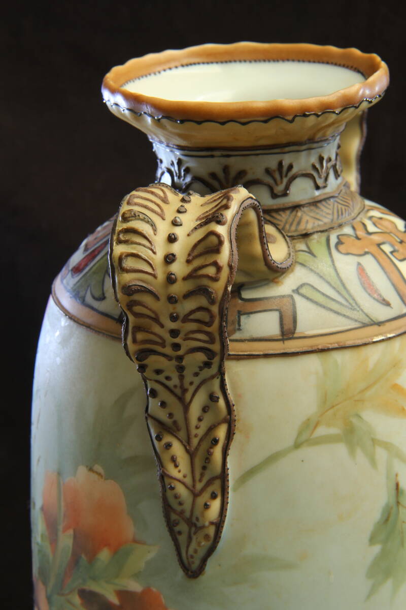 3105 オールドノリタケ フラワーベース M-NIPPON 明治 芥子の華柄 盛上げ技法 葉を模したハンドル