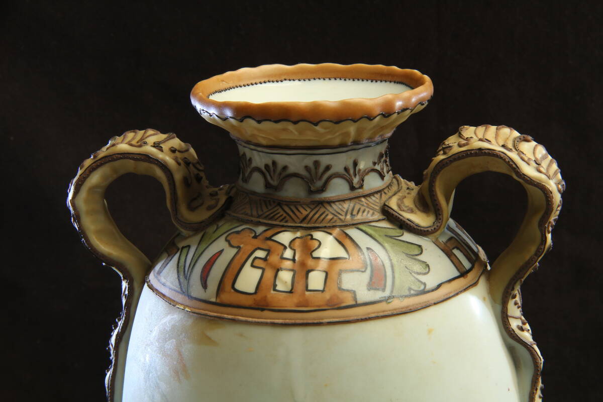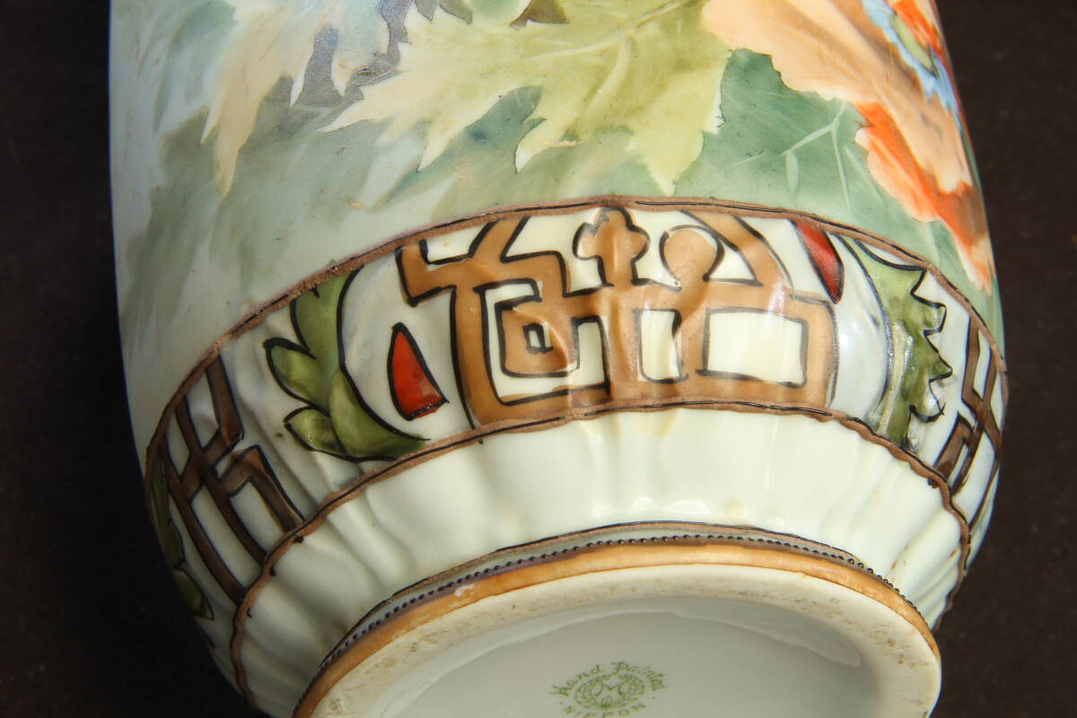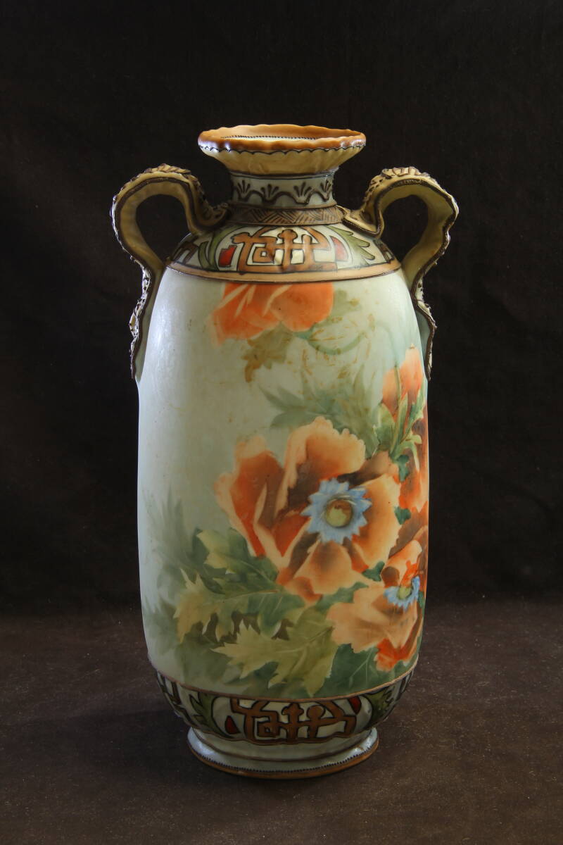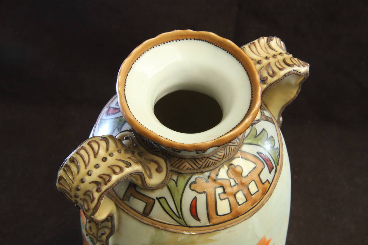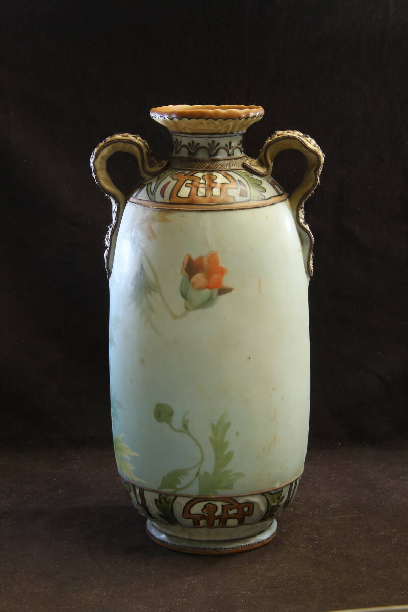 3105 オールドノリタケ フラワーベース M-NIPPON 明治 芥子の華柄 盛上げ技法 葉を模したハンドル