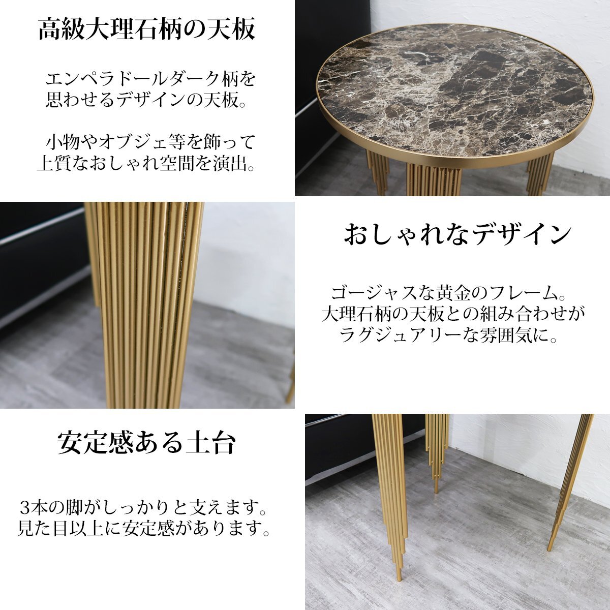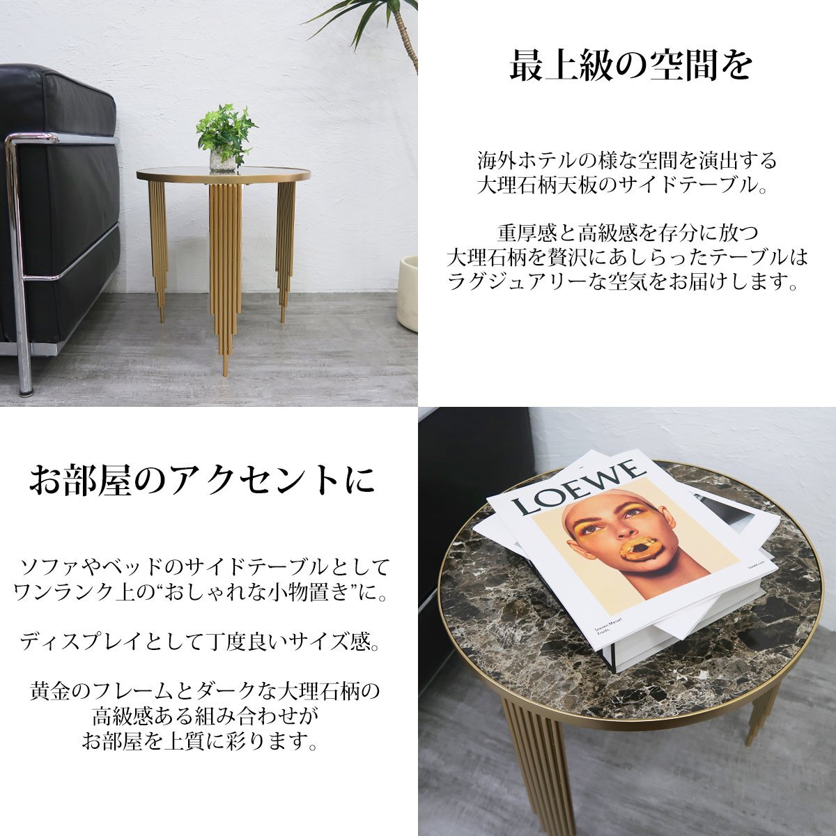![]() ※画像一枚目の商品になります。 最上級の空間を。 海外ホテルの様な空間を演出する大理石柄天板のサイドテーブル。 重厚感と高級感を存分に放ち、大理石柄を贅沢にあしらったテーブルはラグジュアリーな空間作りに最適です。 天板表面は綺麗に加工されており耐久性があります。 撥水性、キズに強く、拭き取り簡単でお手入れラクラク 。 黄金のフレームとエンペラドールダーク柄を思わせる大理石柄天板の組み合わせが 他にはない特別な空間を彩ります。 ソファ横、ベッドサイド、リビング等に置いてワンランク上のおしゃれな小物置きに。 高級感あふれるデザインが視覚的な楽しみも与えてくれるオブジェとしても楽しめます。 商品仕様 サイズ(約):天板直径45cm、高さ46.5cm 重量(約):3.45kg 材質:フレーム:鉄 天板:天然木化粧繊維板(ウォルナット) |
