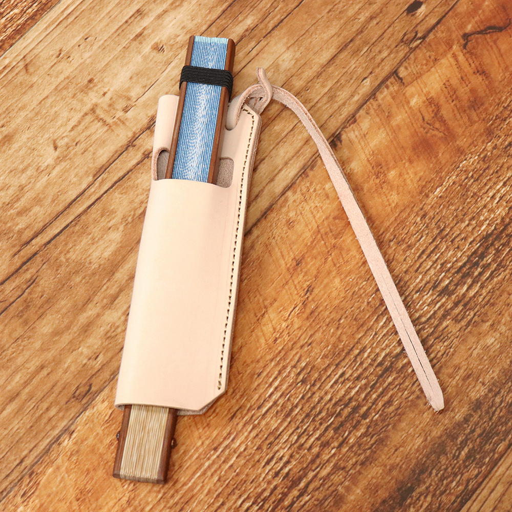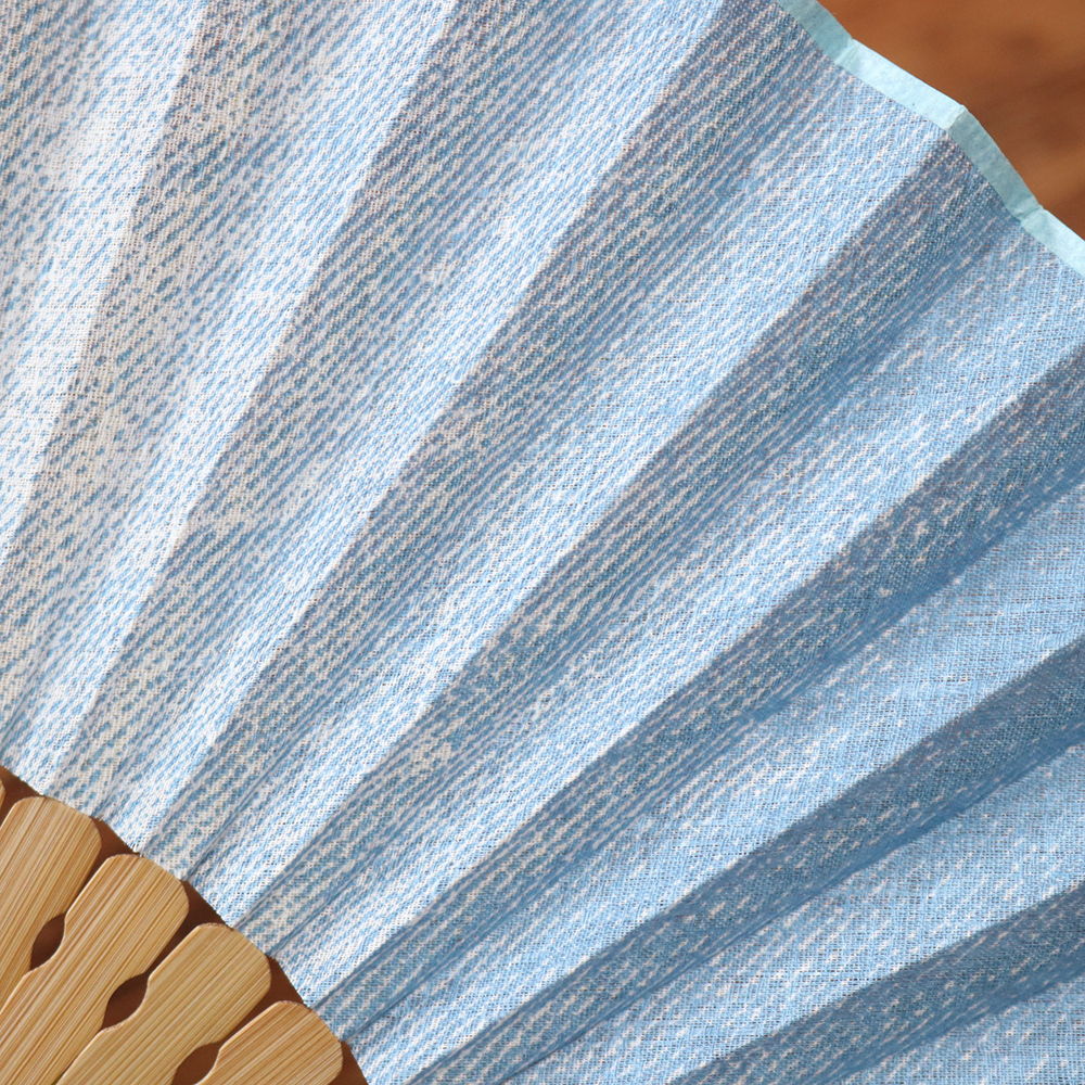 ダメージデニムのような生地を使用した扇子。落ち着いた雰囲気で和装にも普段使いにも合わせやすいデザイン。ヌメ革ケースはストラップでバッグに付けることができます。