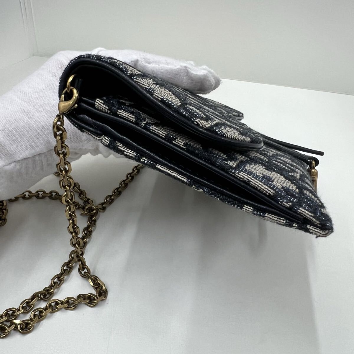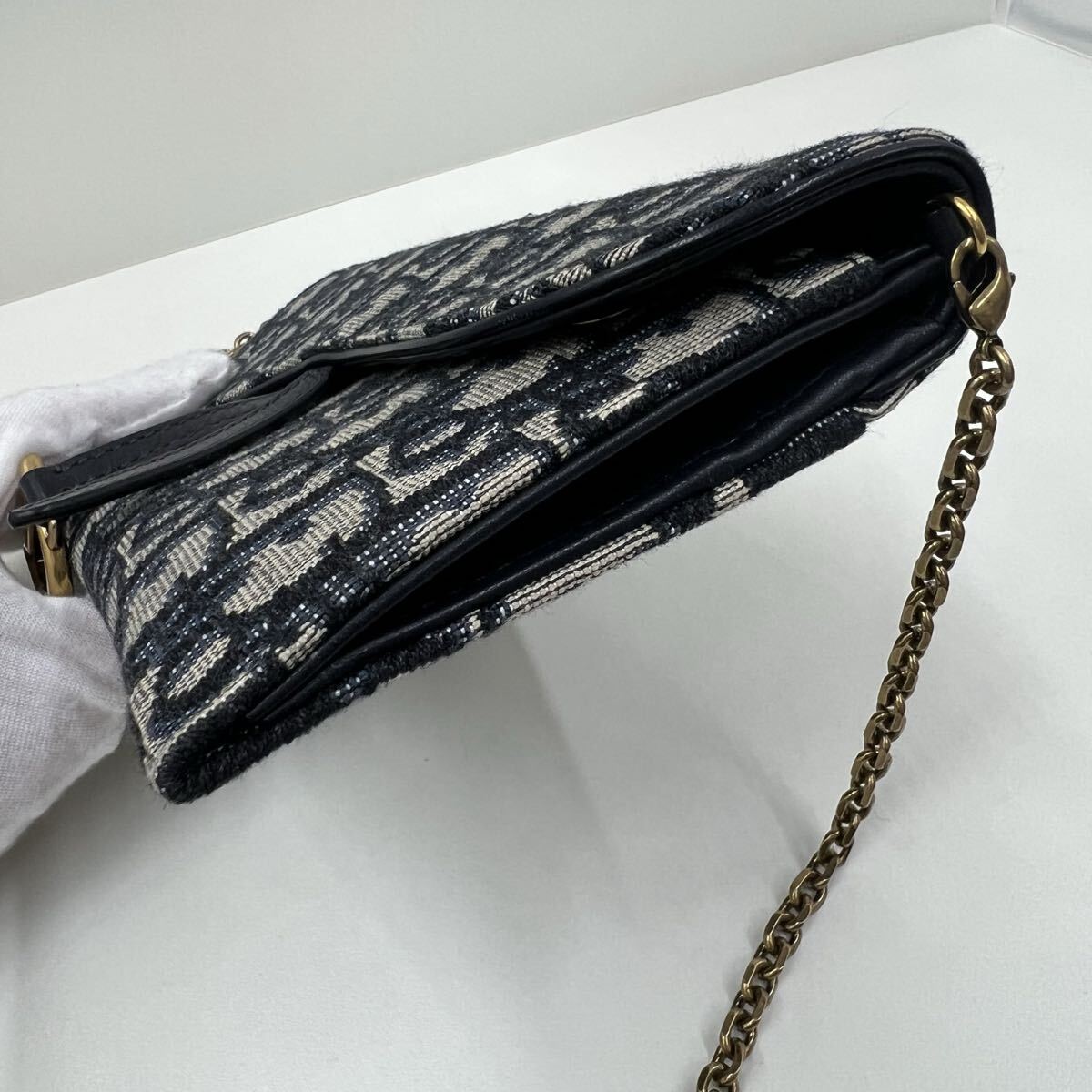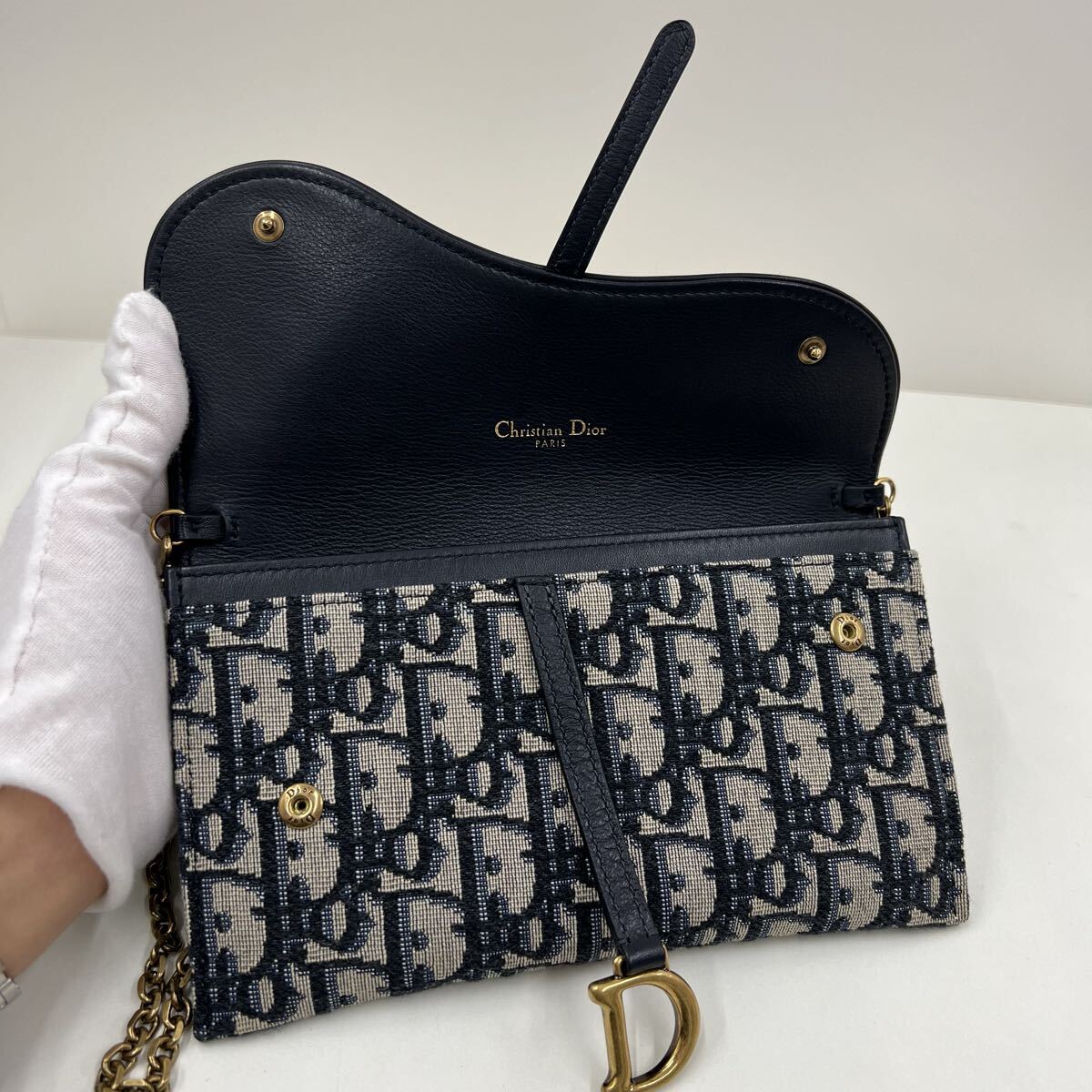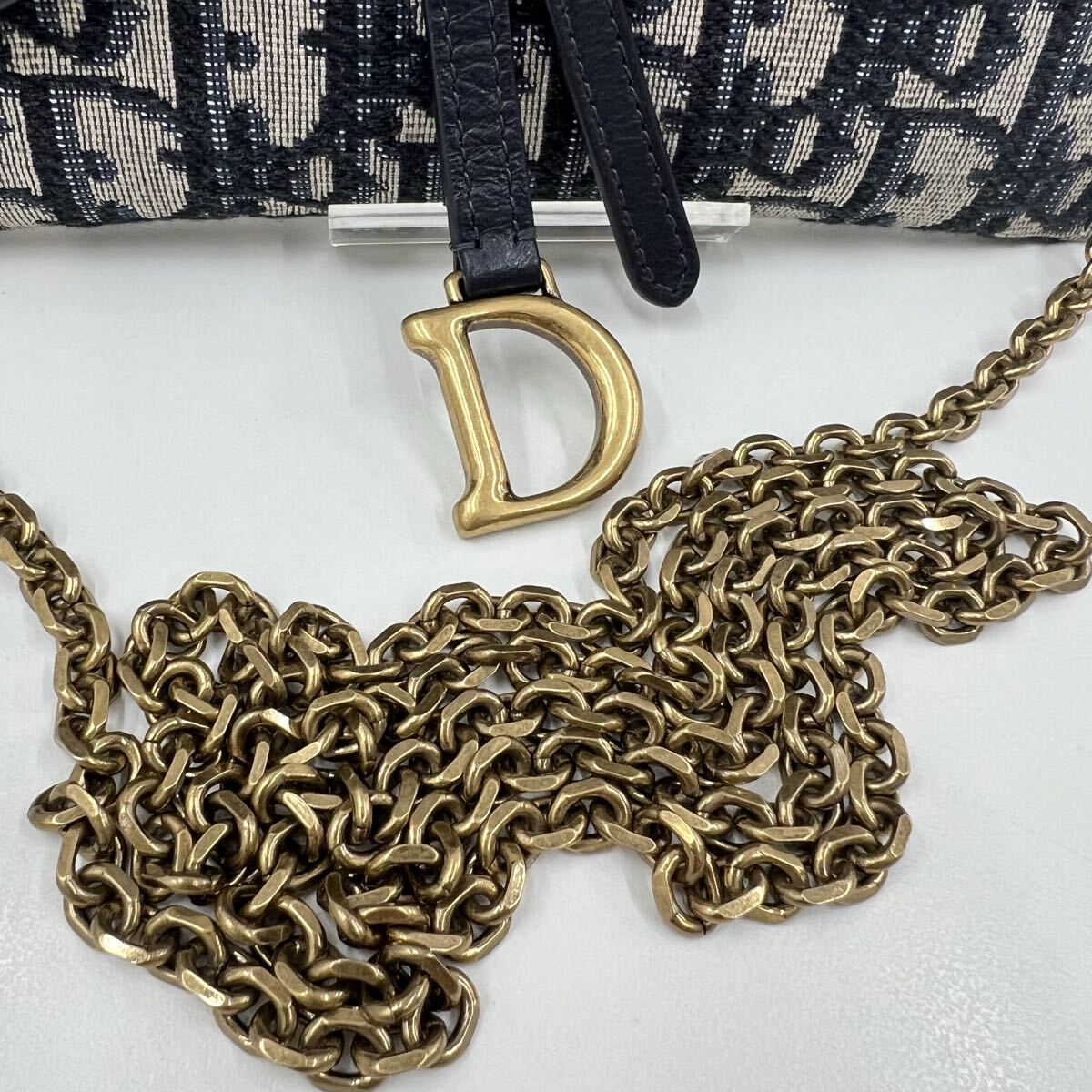 美品 Christian Dior クリスチャンディオール サドル ポーチ ディオールオブリーク ジャカートキャンバス チェーン ネイビー バッグ