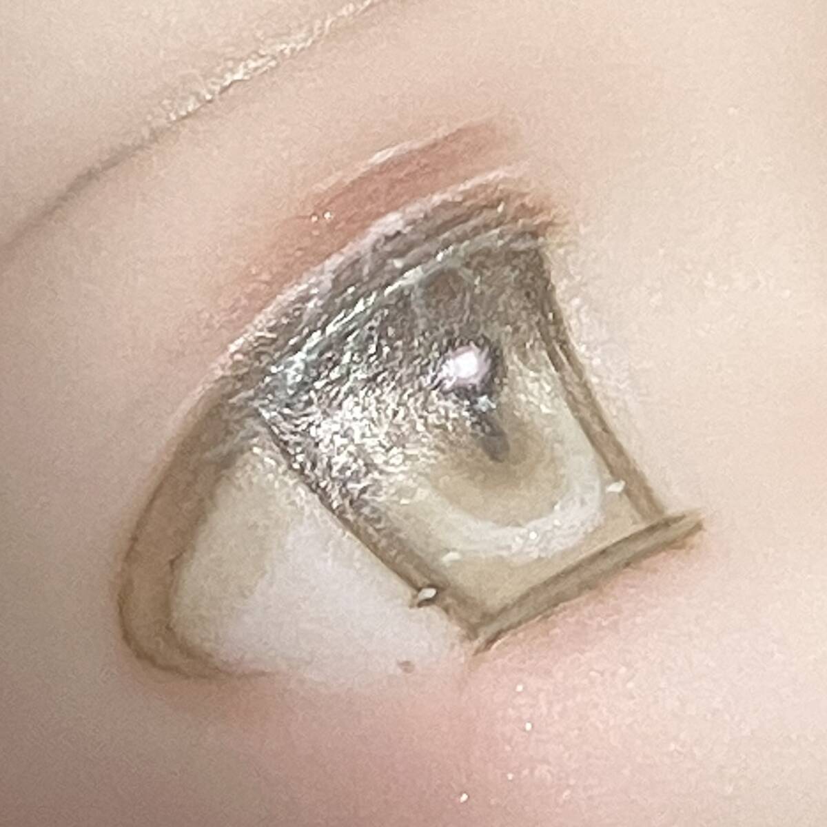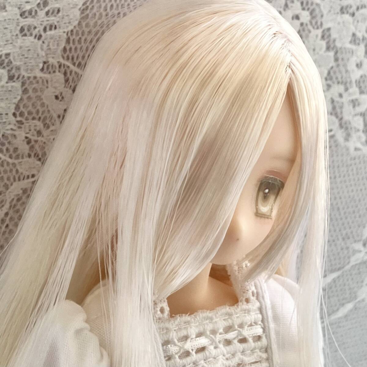 写真ではわかりづらいですが虹彩と瞼にパールの塗装がしてあります。(画像5枚目をご確認下さい。)また、瞳部分は保護剤を塗布しているため若干ツヤがあります。画像4枚目は髪カット前の参考写真です。