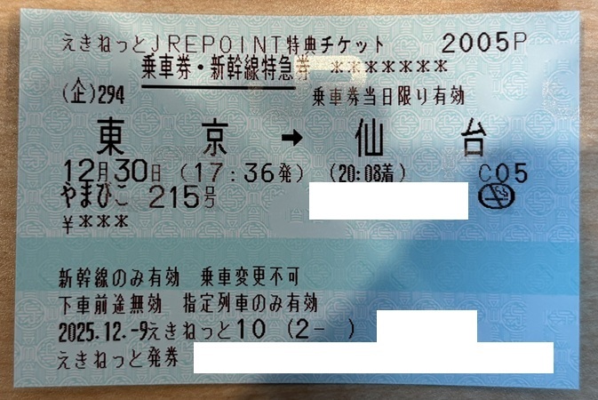 12/30(火) 東京(17:36)- 仙台(20:08) 新幹線乗車券特急券