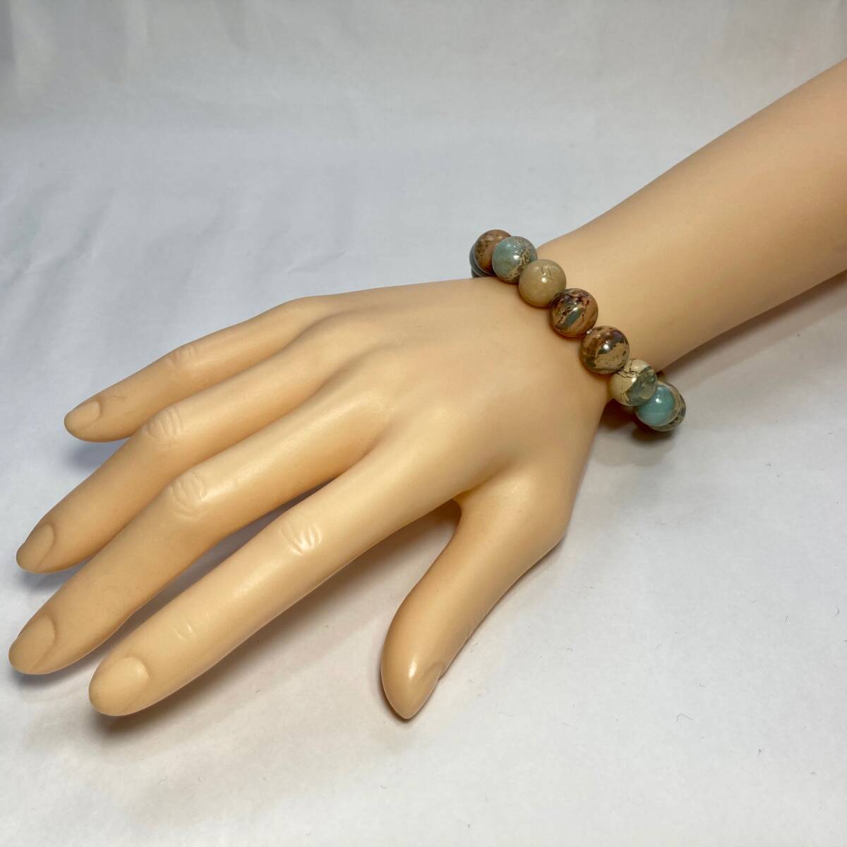こちらは、インプレッションストーンの12mm玉を使用したパワーストーンブレスレットです。シンプルなデザインですのでどんなコーディネートとも合わせ易いブレスレットです。程よくインパクトがある12mm玉を使用してサイズは内径約17cmです。(サイズ変更の場合は取引ナビにてご連絡をお願いします。) 数に限りがございますので気になる方はお早めにどうぞ。