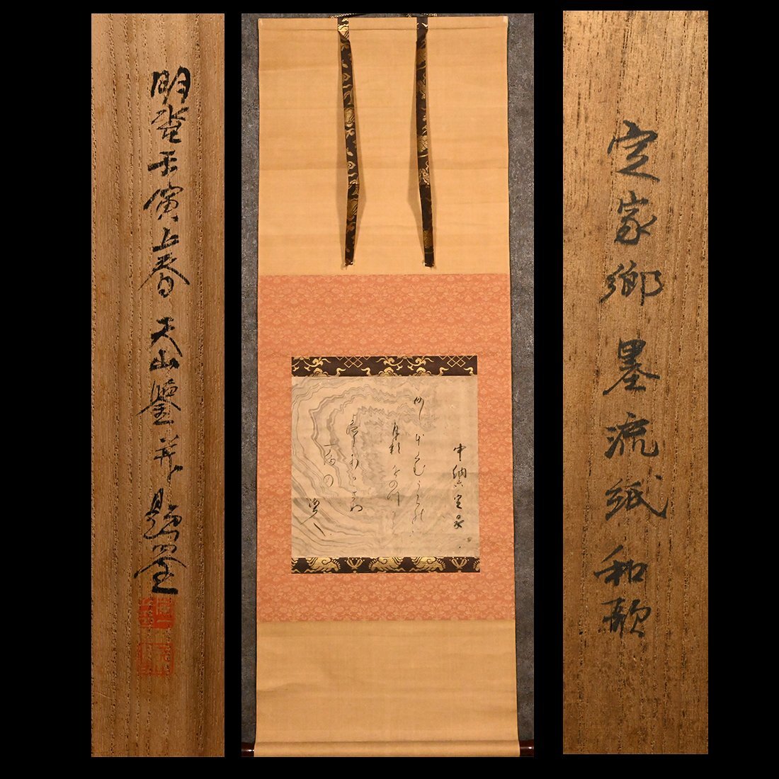 【永】a022【兵庫県の図書館や博物館の館長を歴任された歴史研究家遺族委託品】掛軸 藤原定家 鑑定箱 墨流紙 和歌幅 優品希少品