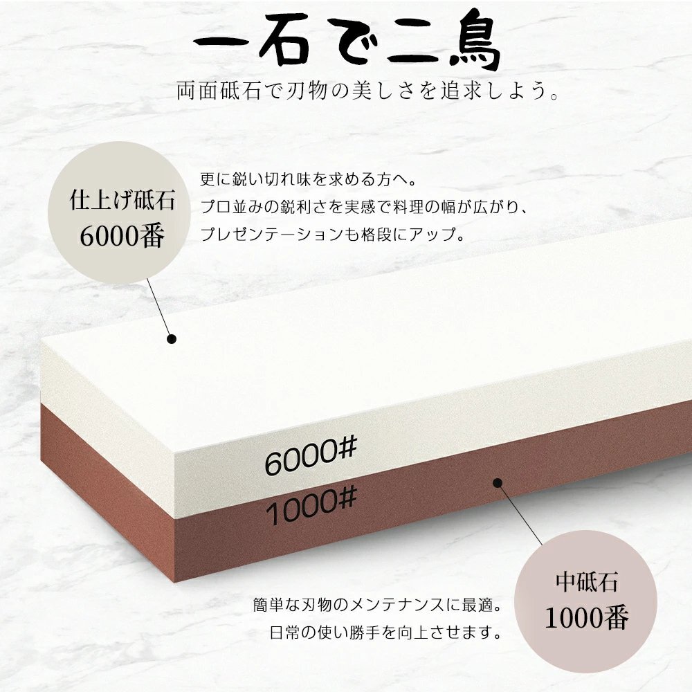 ▲【両面砥石】一方が1000目、もう一方が6000目という二重仕上げの砥石は、日常の刃物メンテナンスからより鋭い切れ味を求める方まで対応可能です。